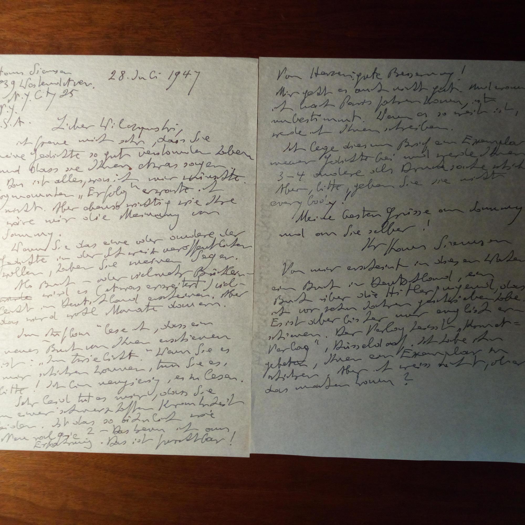 1891-1969, Journalist, Schriftsteller und engagierter Homosexueller - E. Brief mit U., New York 28.7.1947, 2 S. kl. 4°. An den Schriftsteller Karl Wilczynski (1884-1959) in Berlin: Inh.reich betr. beider Arbeiten (erw. sein Buch über die Hitlerjugend). Beiliegt e. Brief mit U., Zürich ohne D., 1 S. 8° quer, s. Schwester, der Pädagogin und Sozial-Politikerin Anna S. (1892-1951): ...Mein Bruder Hans ist seit Mai 1941 in USA New York City. Seit 2 Jahren habe ich aber keine direkte Nachricht von ihm...