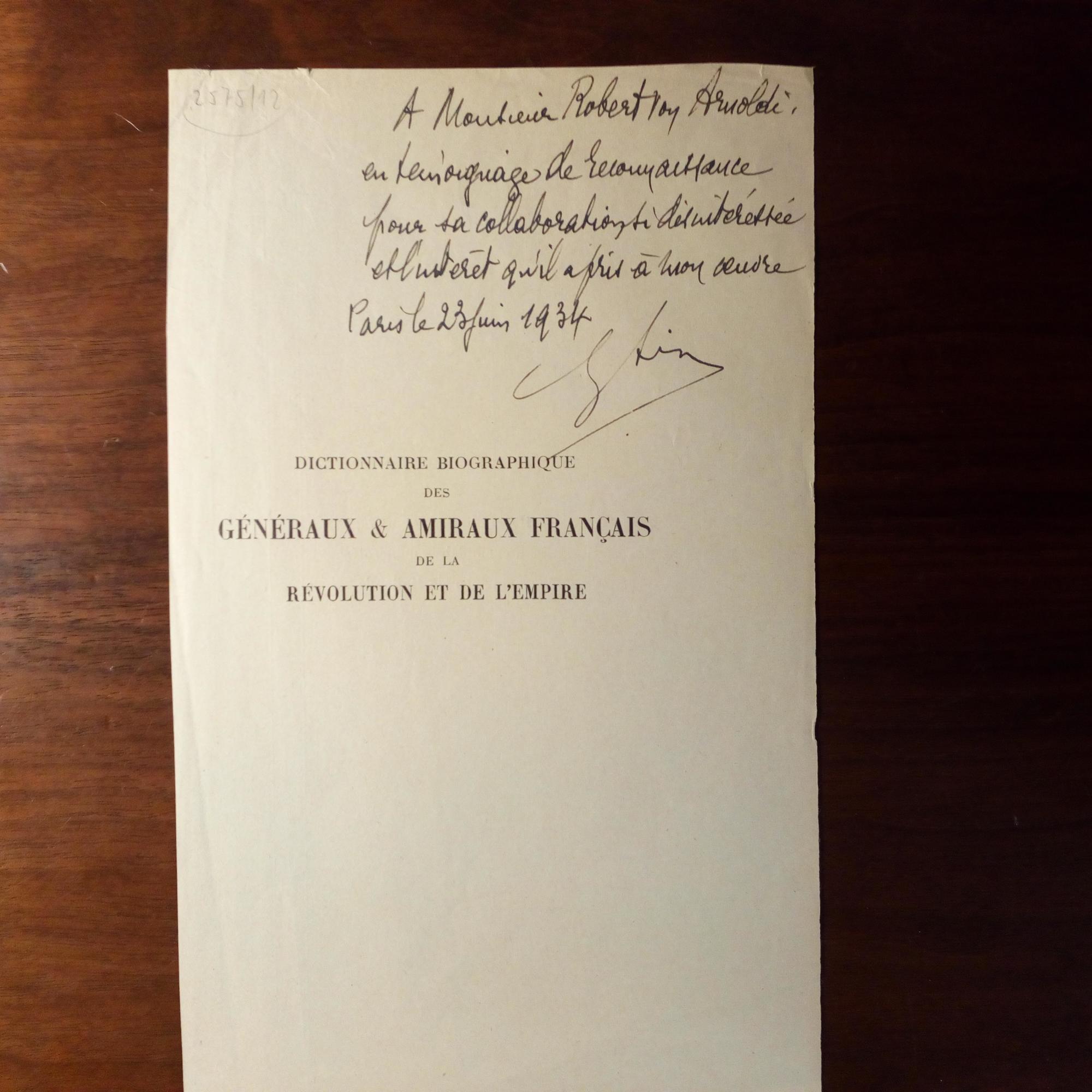 1887-1952, frz. Historiker - Ausführl. Widm. für seinen Mitarbeiter Robert von Arnoldi, Paris 23.6.1934, auf herausgetrenntem Vortitel seines "Dictionnaire biographique des généraux & amiraux Français de la revolution de de l'empire".