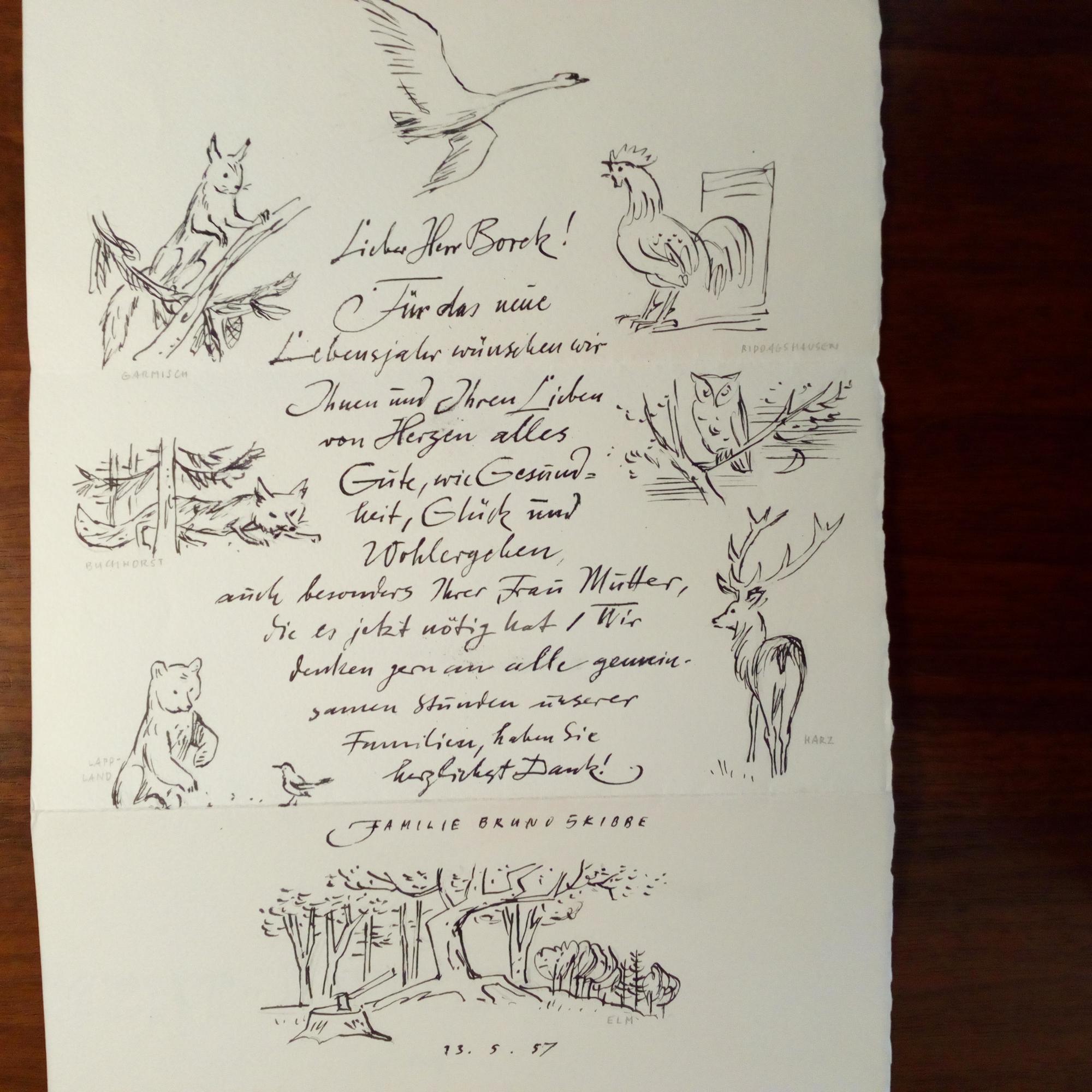 1906-75, Grafiker - 2 e. schöne und aufwendige Künstlerbriefe (mit e. Zeichnungen) je mit U., 1 S. gr. 4°, Blatt mit Lithographie und 4 e. Briefe mit U. und D. (Braunschweig 1955-69), 1 S. 4° und 3 ½ S. 8°, einer mit weiterer mont. Lithographie. 2 e. postal. Umschläge. Herzlich an Friedrich Borek in Braunschweig (aus der gleichn. Verleger-Familie): Privates, u.a. zur Matterhorn-Besteigung dessen Sohnes.