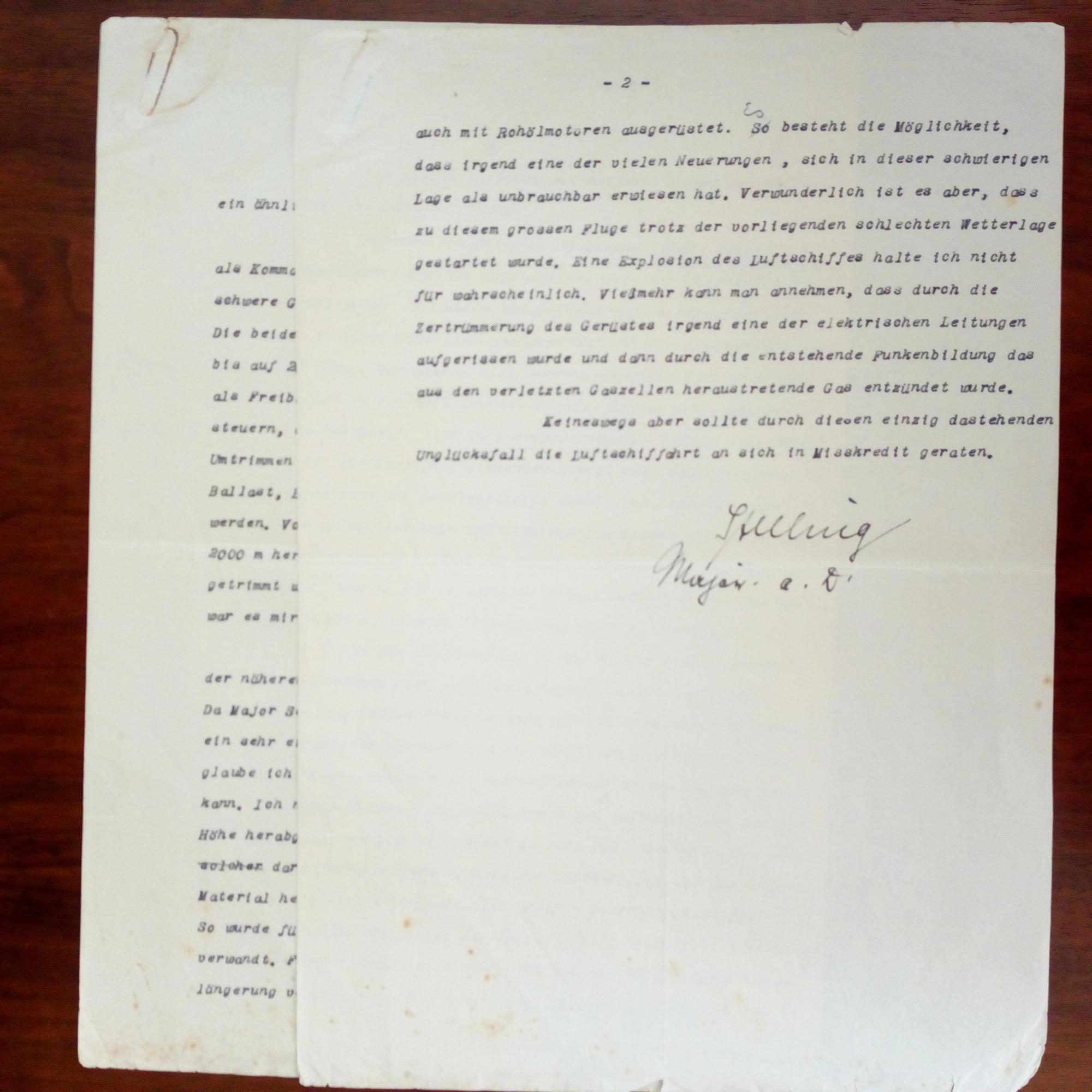 1874-1950, Offizier, Kapitän der Parseval-Luftschiffe - Typoskript mit kl. e. Korrekturen, U. und e. Zusatz, 1 ½ S. 4°, kl. Altersspuren. Bericht über einen Unfall über der Nordsee mit seinem Luftschiff während des Krieges im Oktober 1917.