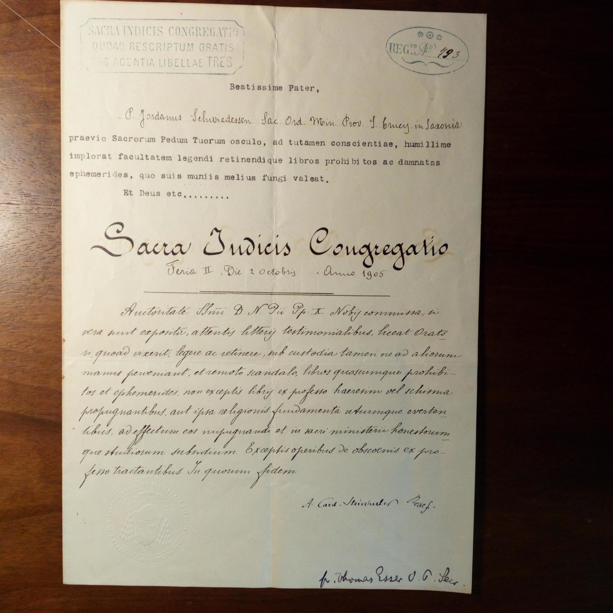1825-1907, Theologe, Jesuit, Kurien-Kardinal - Urkunde mit U., Gegenzeichn. von Bischof Thomas Esser (1850-1926), Rom 2.10.1905, Abs.stempel, leichte Gebr.spuren. Der sächsische Pater Jordanus Schwiedessen wird in die "Sacra Iudicis Congregatio" aufgenommen. Beiliegt eine Urkunde (ausgef. Vordruck, 24.7.1902) im Namen des Paderborner Bischofs Wilhelm Schneider (1847-1909), bischöfl. Prägesiegel, U. von Generalvikar Schmitz, zur Aufnahme von Schwiedessen in die theologische Rechtsfakultät von Paderborn. Beides mit ger. Altersspuren.
