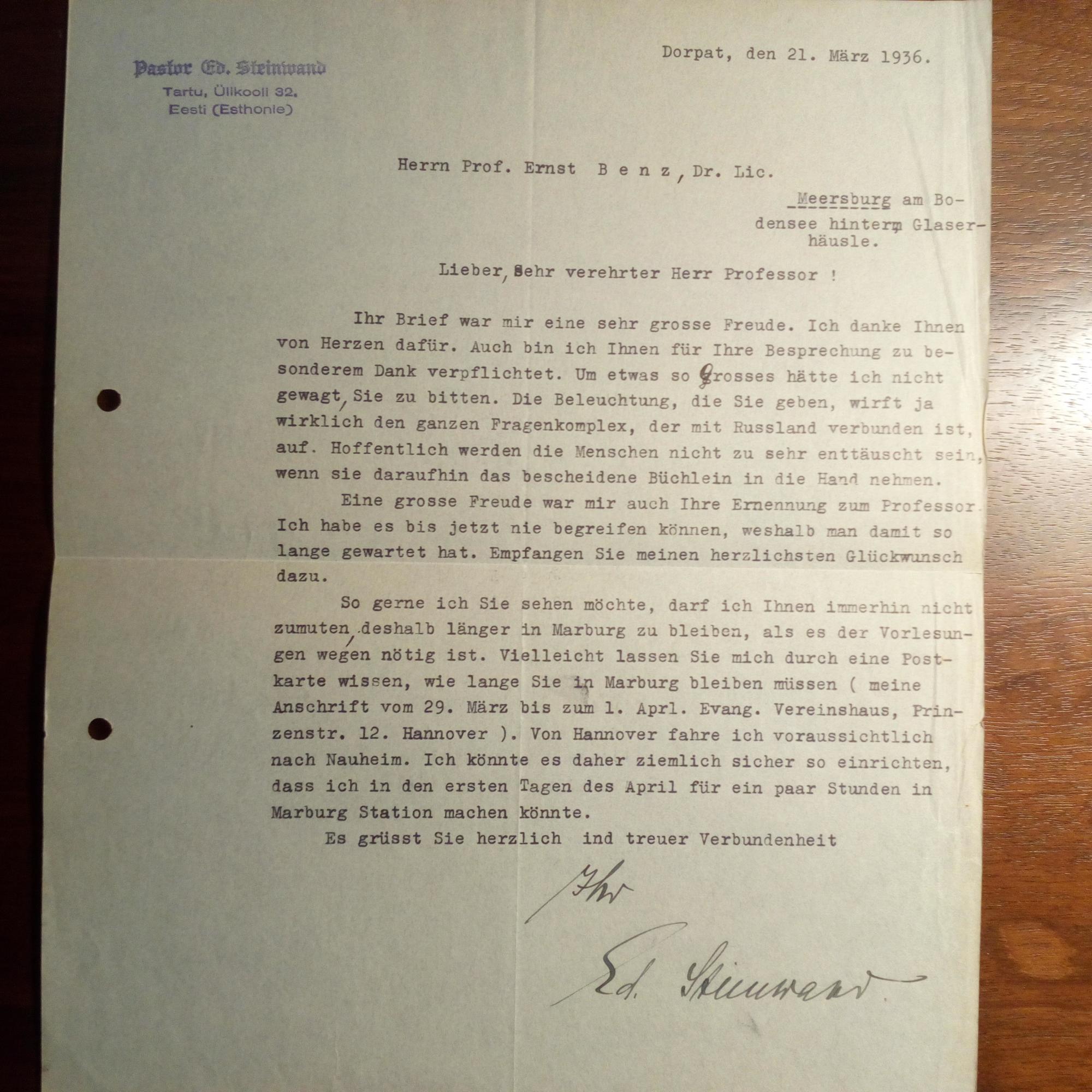 1890-1960, Theologe - Br. m. U., Dorpat (heute Tatu, Estland) 21.3.1936, 1 S. 4°, Abs.stempel, gel. An den Theologen Ernst Benz (1907-78) in Marburg: Dankt für eine Besprechung des Buches "Des Glaubens Not und Sieg in Russland" (Ansprachen von Oskar Schabert und sich): ...Die Beleuchtung, die Sie geben, wirft ja wirklich den ganzen Fragenkomplex, der mit Russland verbunden ist, auf. Hoffentlich werden die Menschen nicht zu sehr enttäuscht sein, wenn sie daraufhin das bescheidene Büchlein...