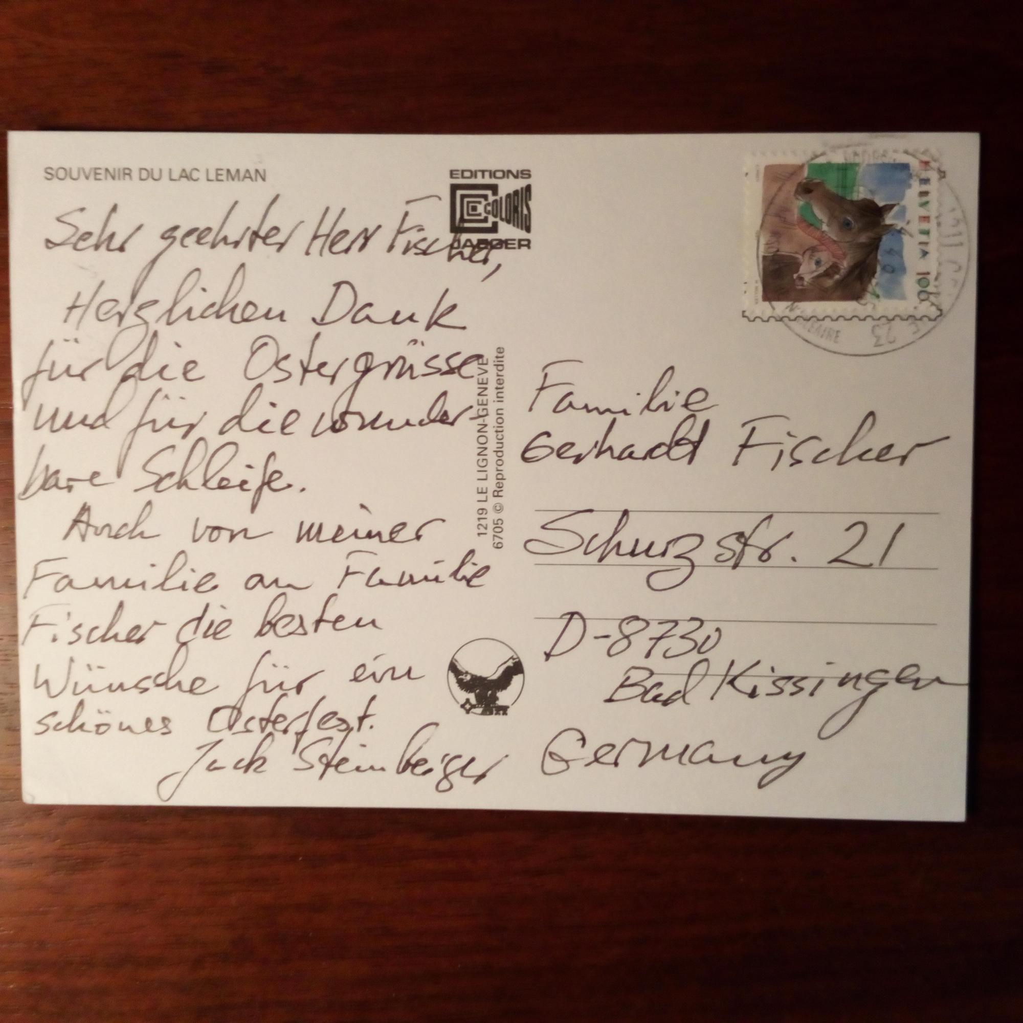 1921-2020, US-Physiker - E. postal. (4.4.1995) Ansichtskarte (Genfer See). An Familie Fischer in Bad Kissingen (sein Geburtsort): Dankt für Ostergrüße.