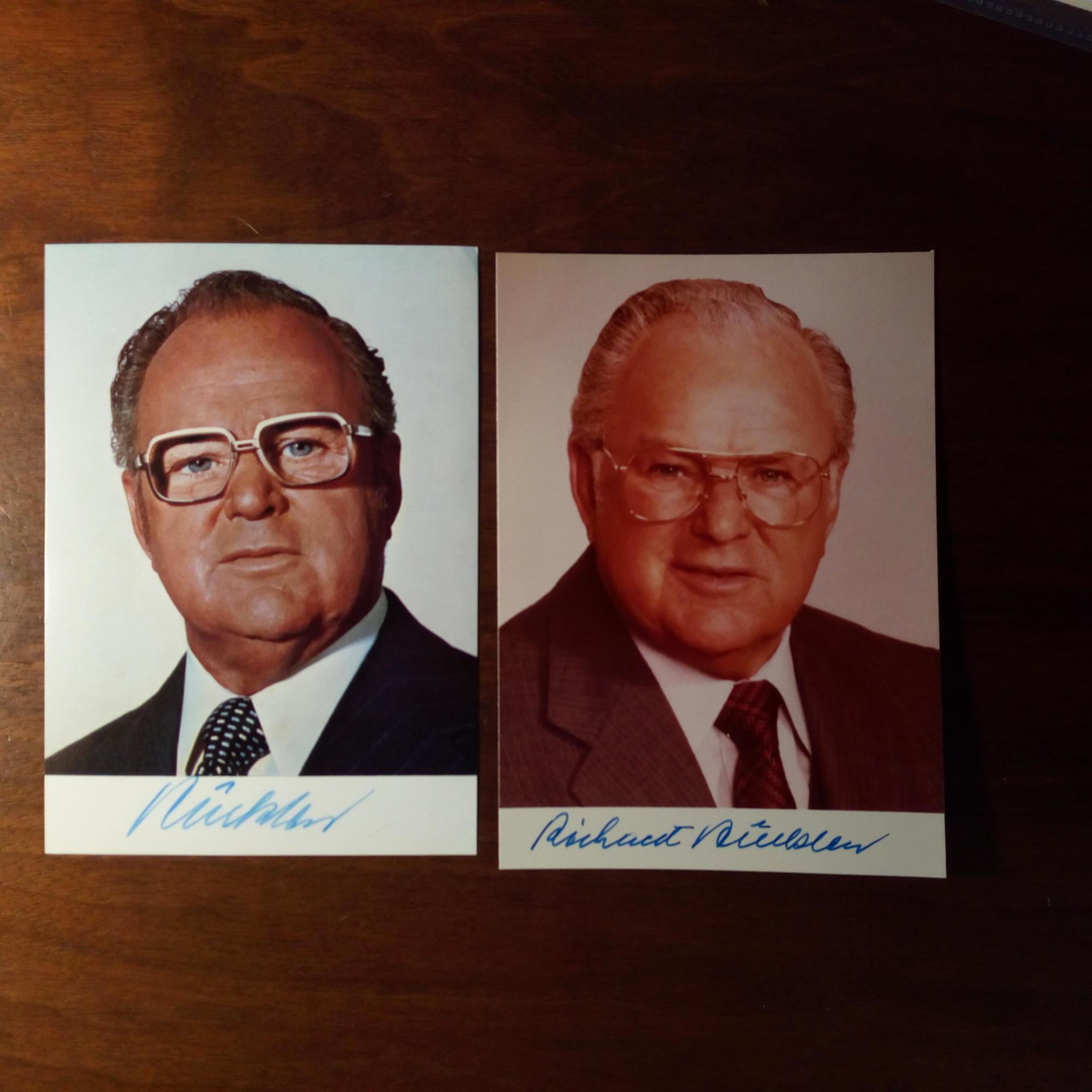 1916-2002, Politiker (CSU), Bundest.präsident - 3 Briefe mit U., 1982/83, zus. 4 S. 4°, Briefkopf, in denen er zu polit. Fragen Stellung nimmt. Beiliegen: Karte mit e. Zitat und U. (7.4.1988), Foto (m. Helmut Kohl), U. von beiden, 3 Farb-Pfo. und 8 kl. Stücke, je mit U.