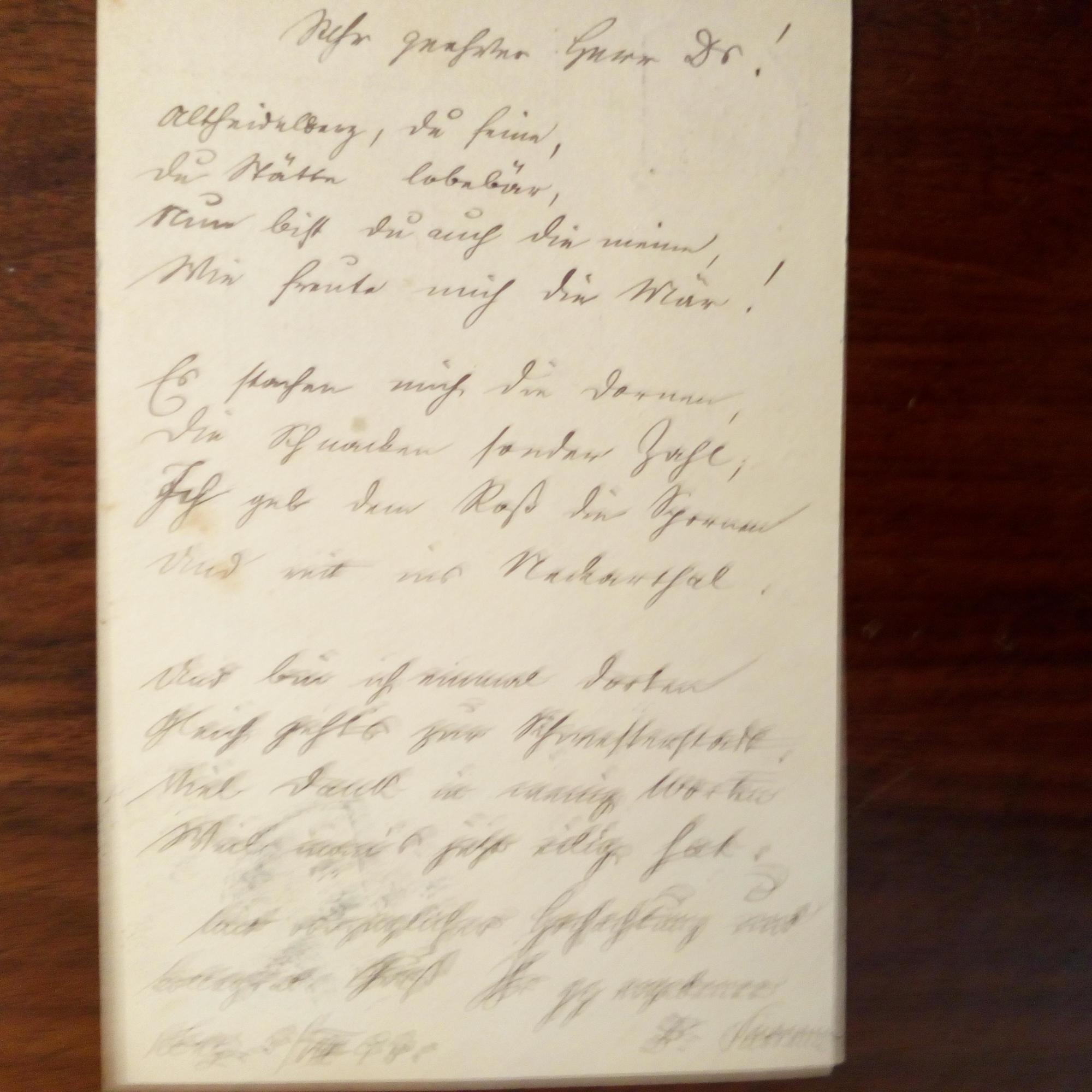 1857-1917, Hamburger RA und Dichter - Schöner e. Br. m. U., Hamburg 7.12.1899, 1 ½ S. kl. 8°, Adr.briefkopf, schwarzer Rand. Erfüllt den Wunsch einer Dame nach einem "ungedruckten Gedicht", welches er auf eine weitere S. geschrieben hat: "Am Himmelssaum/ Ein silbernes Flimmern-/ Mir ist wie im Traum... (8 Z.), darunter nochmals U., O. u. D.