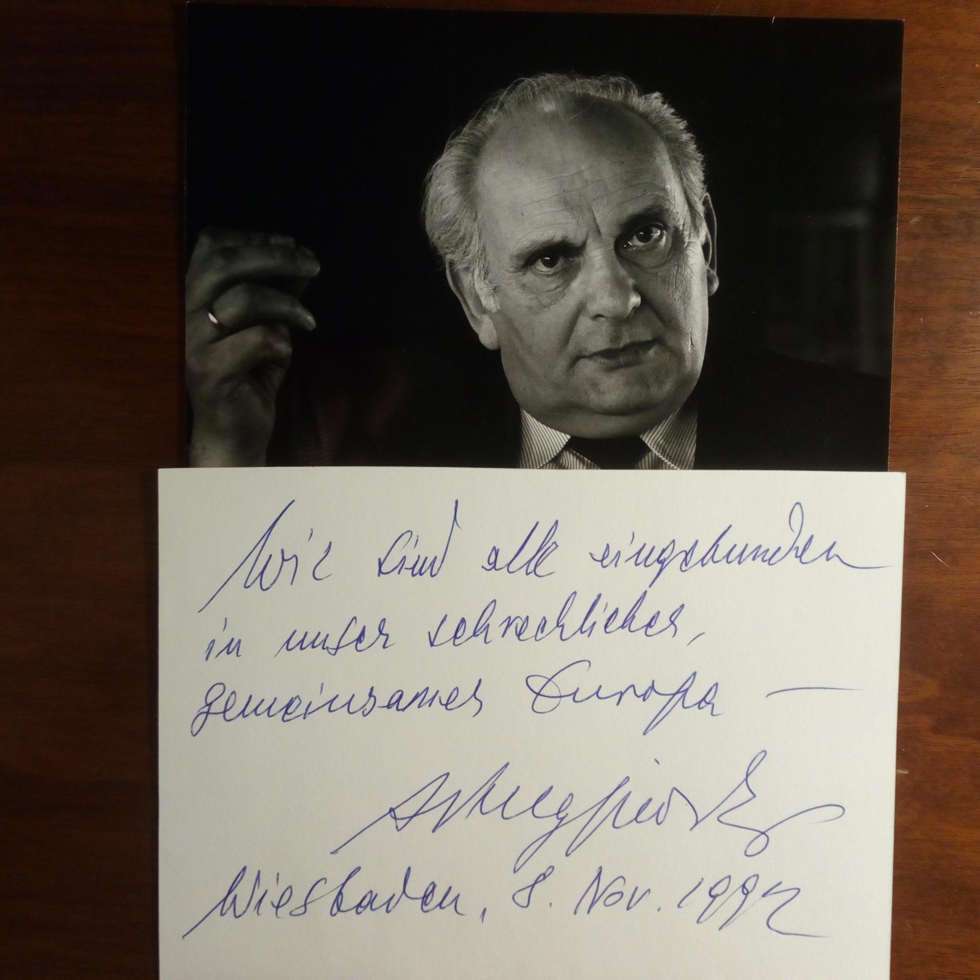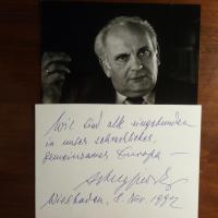 1924-2000, poln. Schriftsteller - Kl. Hochglanz-Pfo. (beschn.) m. Widm. u. U. auf Rückseite, 15.2.1996, kl. Tintenfleck. Mit Begleitbr. m. U., privater Br.kopf.