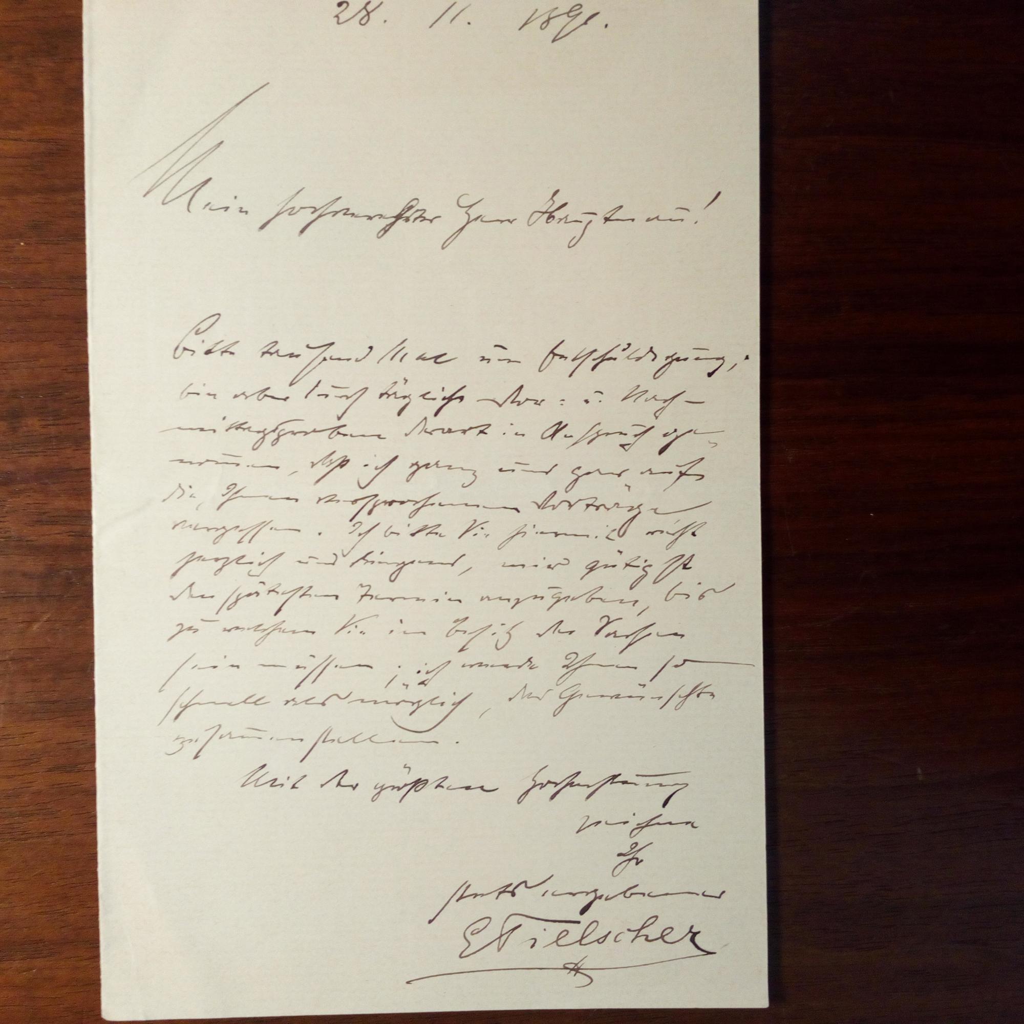 1859-1941, Humorist, Schausp., Couplet-Sänger - E. Brief mit U., (Berlin) 28.11.1891, 1 S. kl. 8°, kl. Schrift. An "Herrn Hauptmann": Er habe die "versprochenen Verträge" völlig vergessen. Er solle den "späthesten Termin" angeben, bis "Sie im Besitz der Sachen sein müssen".