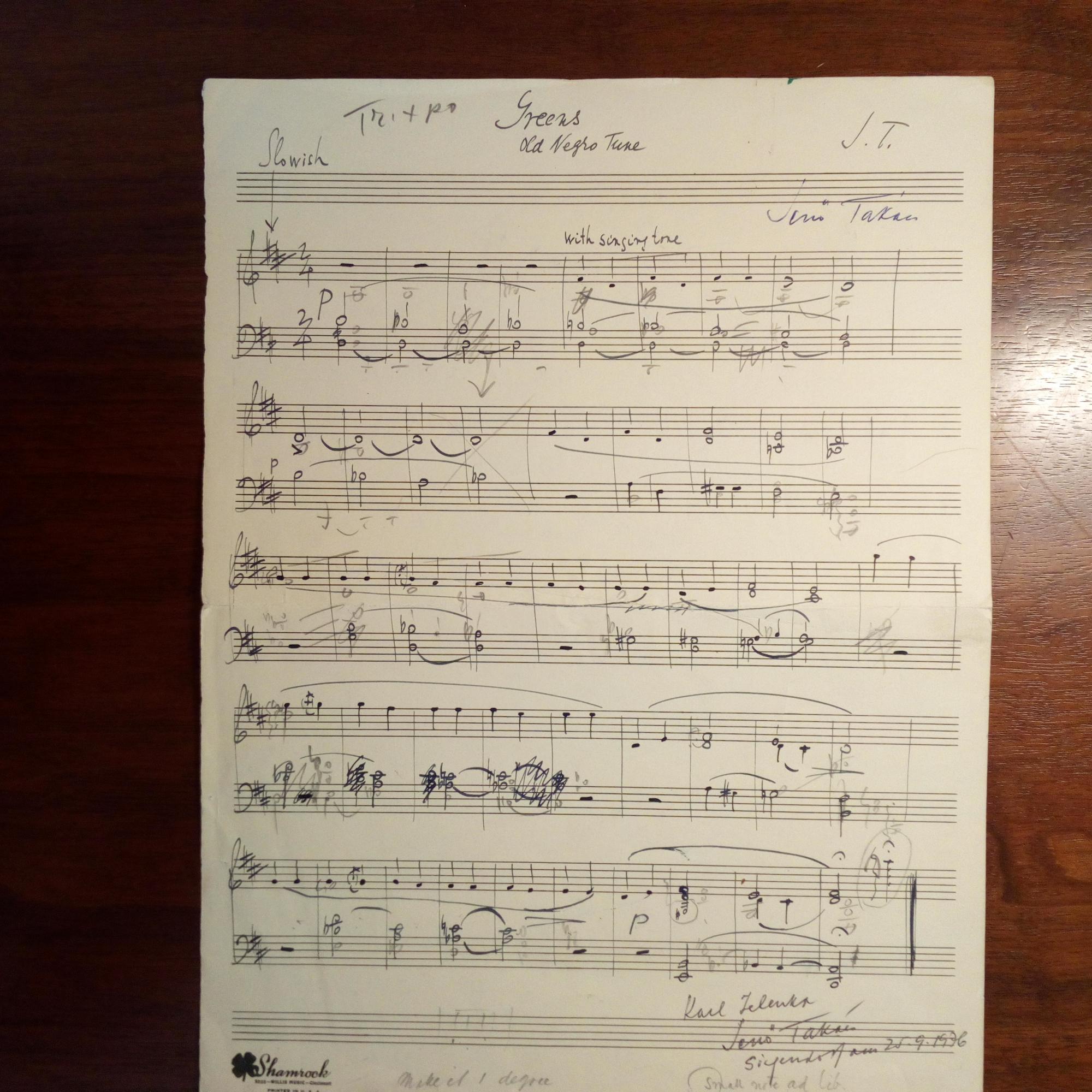 1902-2005, ungar.-österr. Komponist - E. Notenblatt, folio, "Greens. Old Negro Tune", abgeschl. Arbeitsmanuskript m. vielen Bleistift-Korrekturen, m. Monogramm und U. am Kopf. Darunter Widm. m. U., Siegendorf 25.9.1976, für den Musikwissenschaftler Karl Zelenka in Germering. Rückseite ähnlich ohne Widm.: "Kl. Konzert Skizzen".