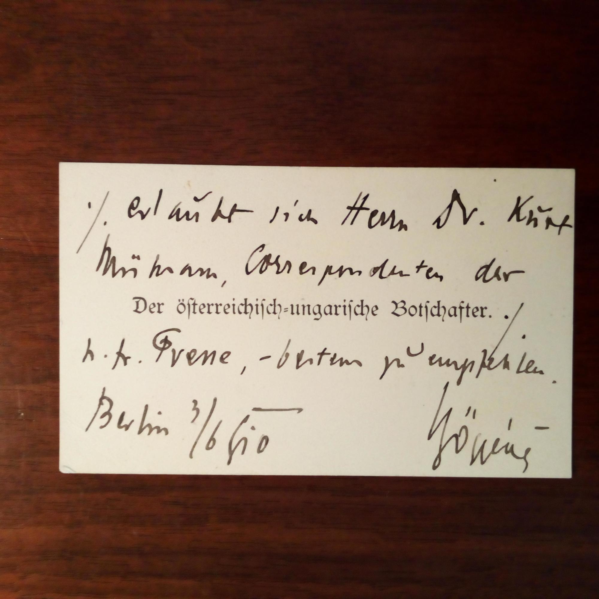 1841-1916, österr.-ungar. Diplomat - Ded.kärtchen mit e. Zeilen und U., Berlin 3.6.1910. Empfehlung für den Korrespondenten der Neuen Freien Presse Kurt Mühsam (1882-1931, österr. Schriftsteller und Filmkritiker).