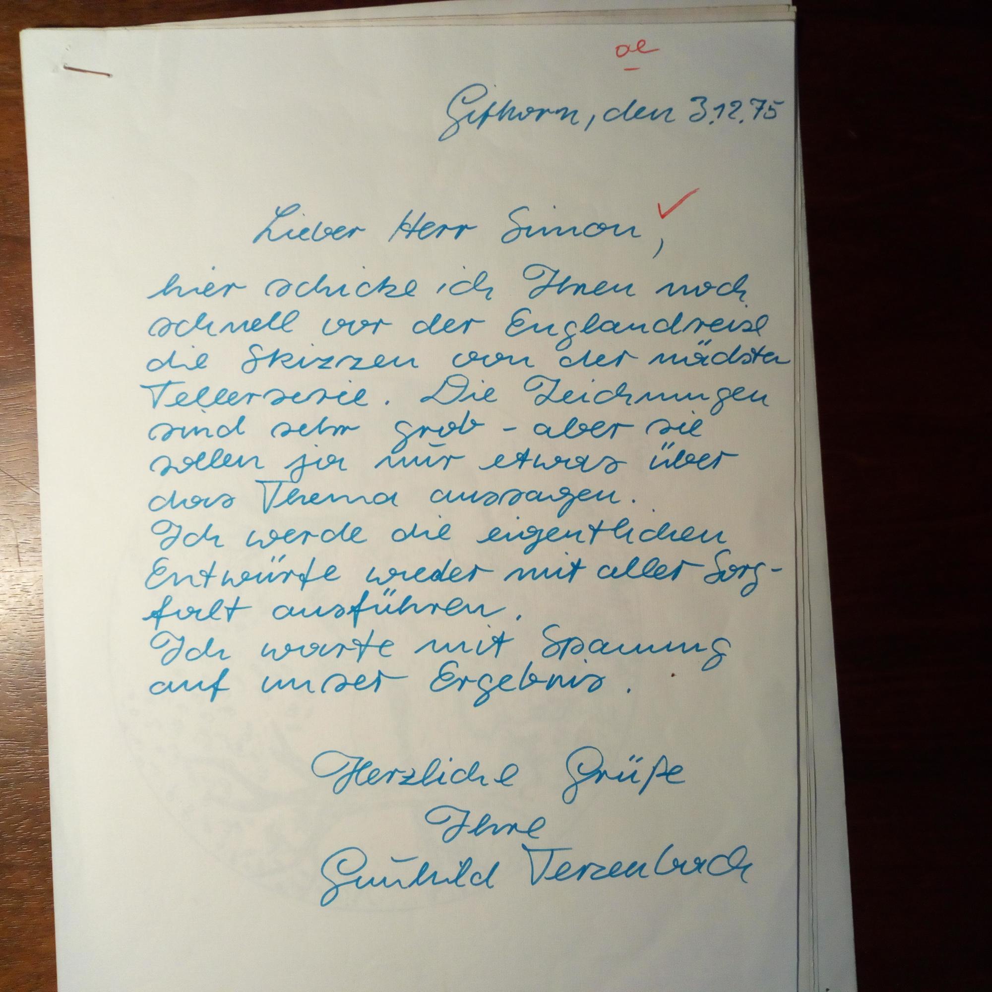 spätere Liljequist, 1936-2022, Porzellan-Malerin und Designerin (VW) - E. Brief mit U., Gifhorn 3.12.1975, 1 S. 4°. Begleitbrief zu 4 angehefteten "Skizzen von der nächsten Tellerserie" (Kopien): ...Die Zeichnungen sind sehr grob...werde die eigentlichen Entwürfe wieder mit aller Sorgfalt ausführen... Beiliegt Weihnachtsklappkarte mit e. Zeilen und U. Wünsche und bedankt sich für eine "wunderbare Schallplatte".