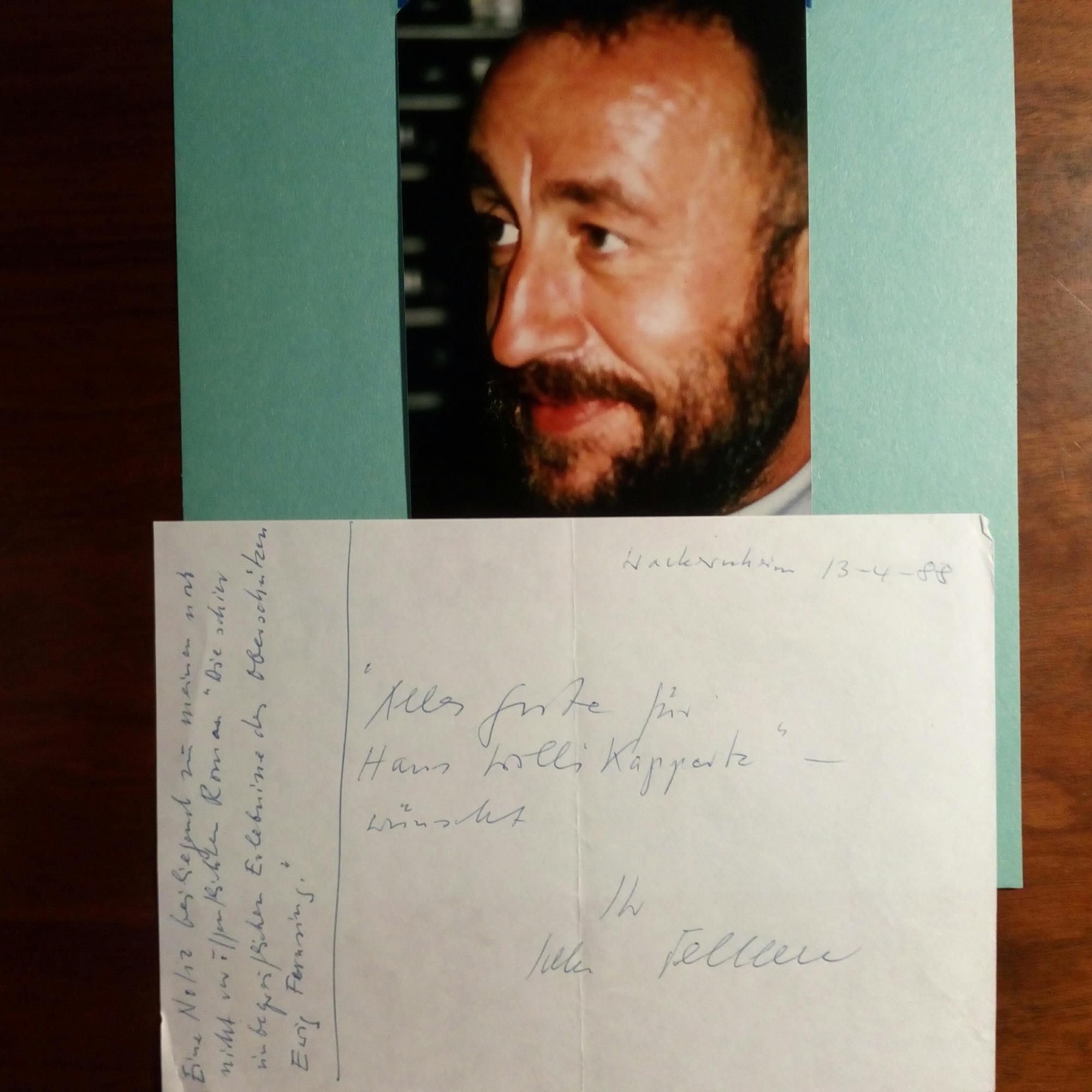 1918-2008, Schriftsteller und Fernseh-Red. - 8°-Blatt mit e. Zitat. Dazu Pfo. und 8°-Blatt mit e. Begleitz., Widm. u. U., Wackernheim (b. Mainz) 13.4.1988. M. e. postal. Umschl. (U. im Abs.).