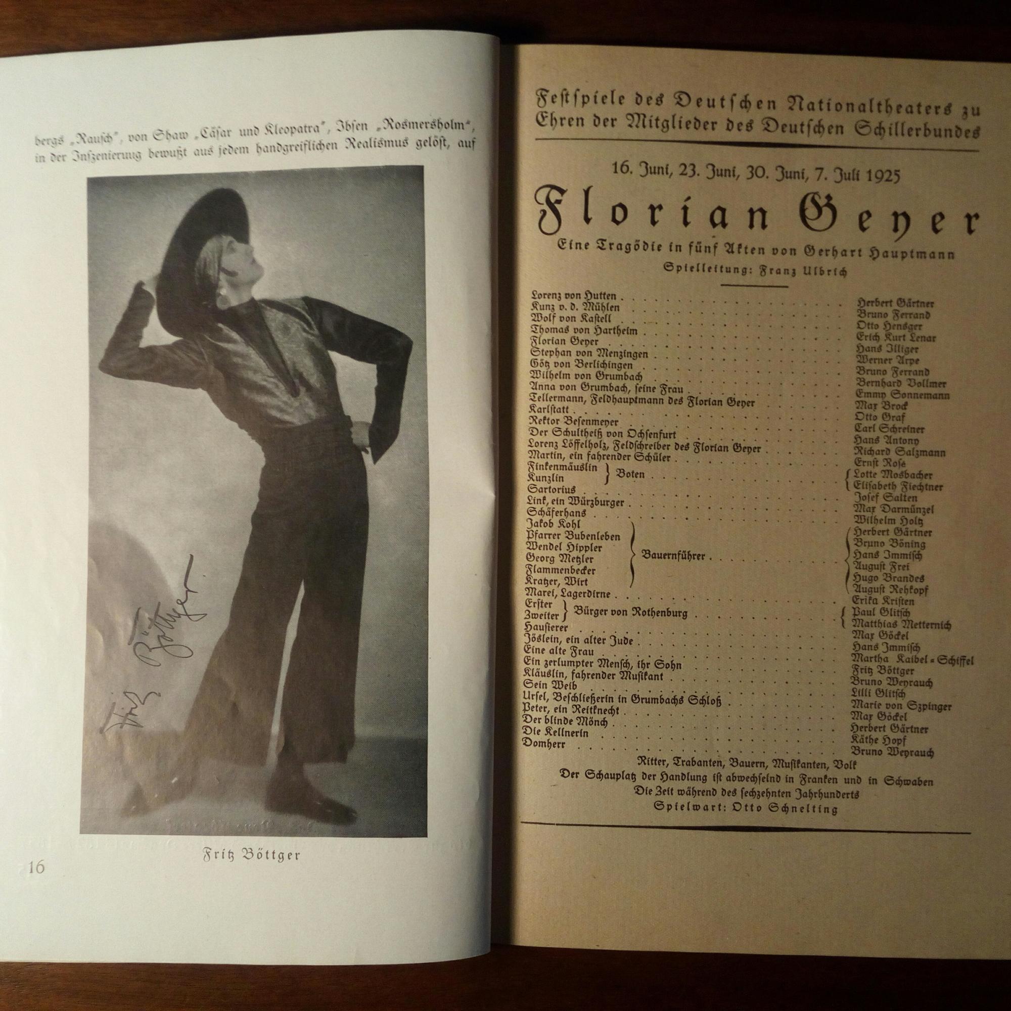 "Almanach des dt. Nationaltheaters Weimar 1925". Darin 48 U. auf den jeweiligen Pfo., kl. Gebr.spuren. Dabei: Emmy Sonnemann (später verh. Göring), E. Praetorius, E. Bergmann, F. Böttger, O. Graf, M. Gräbler, H. Grahl, H. Illiger, E. Kristen, E. Schütte, R. Salzmann...