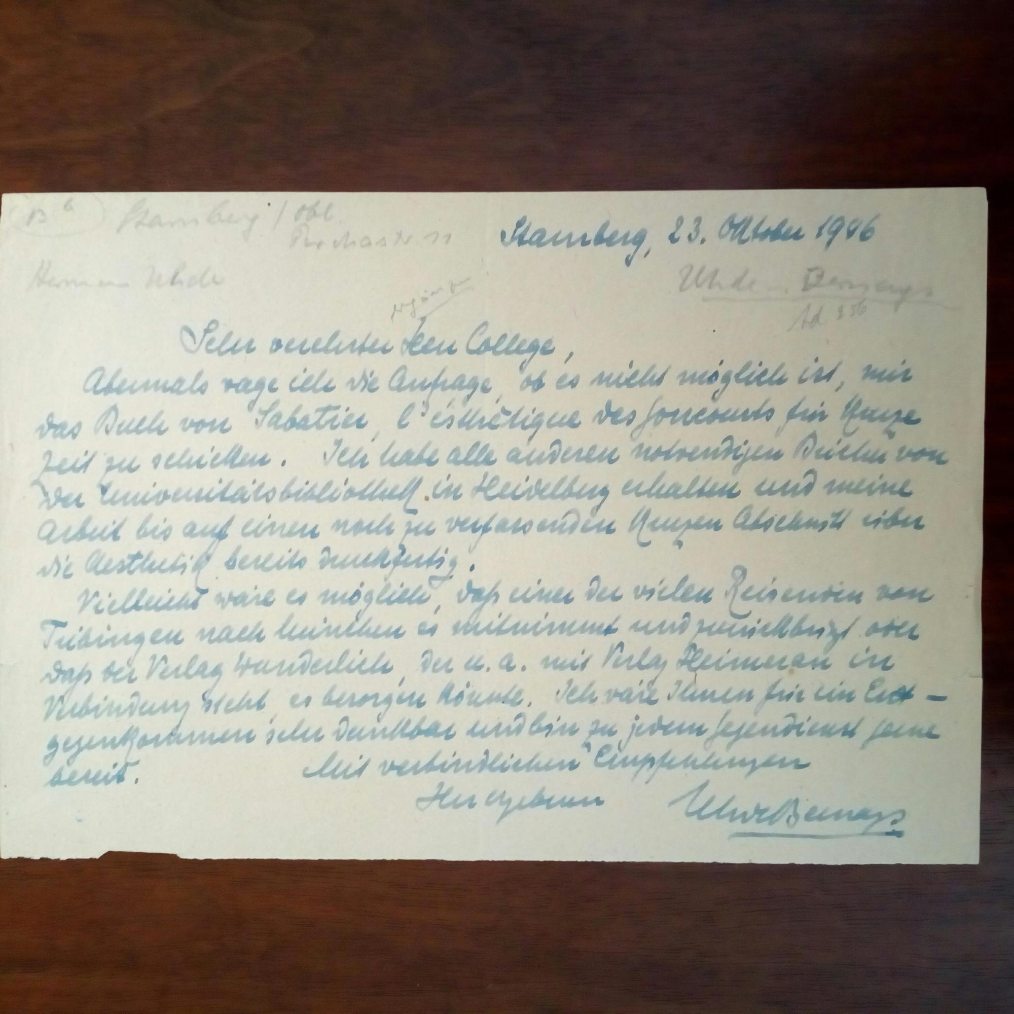 1873-1965, Kunst- und Literaturhistoriker - E. Brief mit U., Starnberg 23.10.1946, 1 S. 8°quer und e. postal. Postkarte mit U., (6.12.1946), beides dicht geschr.. An den Bibliothekar und Bibliothekswissenschaftler Georg Leyg (1877-1968) in Tübingen: Fordert ihn noch einmal auf, ihm ein Buch über die "Goncourts" zu besorgen, denn seine Arbeit sei "bis auf einen noch zu verfassenden kurzen Abschnitt über die Aesthetik bereits druckfertig", und: ...In Tübingen soll eine Hölderlin-Gesellschaft gegründet sein, der ich gerne beitreten möchte...