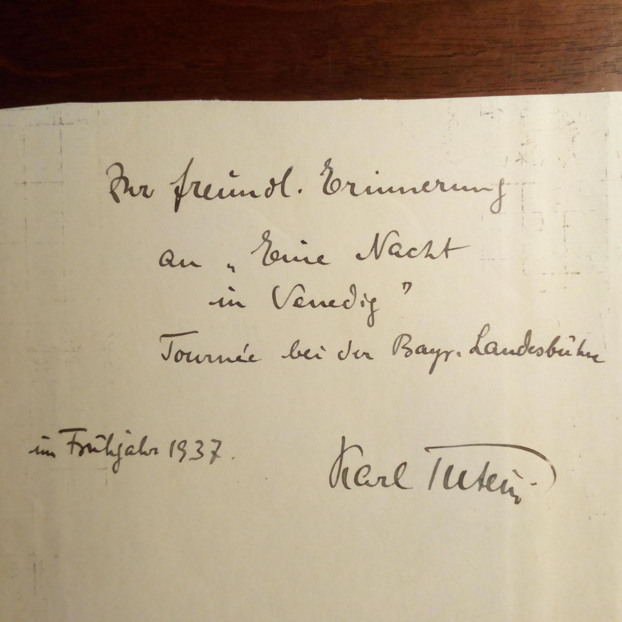1887-1984, Dirigent, Opern-Direktor in Graz - kl. Blatt m. e. "Zur freundl. Erinnerung an "Eine Nacht in Venedig"/ Tournee der Bayer. Landesbühne/ im Frühjahr 1937" u. U. Beiliegt zeitgen. Pfo.