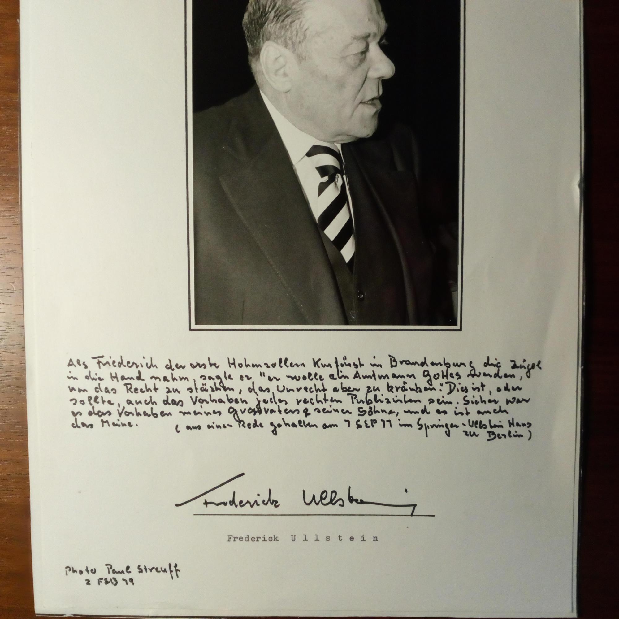 1909-88, brit.-dt. Verleger - E. längeres Zitat (über die Aufgabe eines Verlegers, ...aus einer Rede gehalten am 7 SEP 79 im Springer-Ullstein-Haus zu Berlin...) u. U. unter auf 4° mont. gr. Hochglanz-Pfo. (von ihm beschr.: "Photo Paul Streuff 2 FEB 79").
