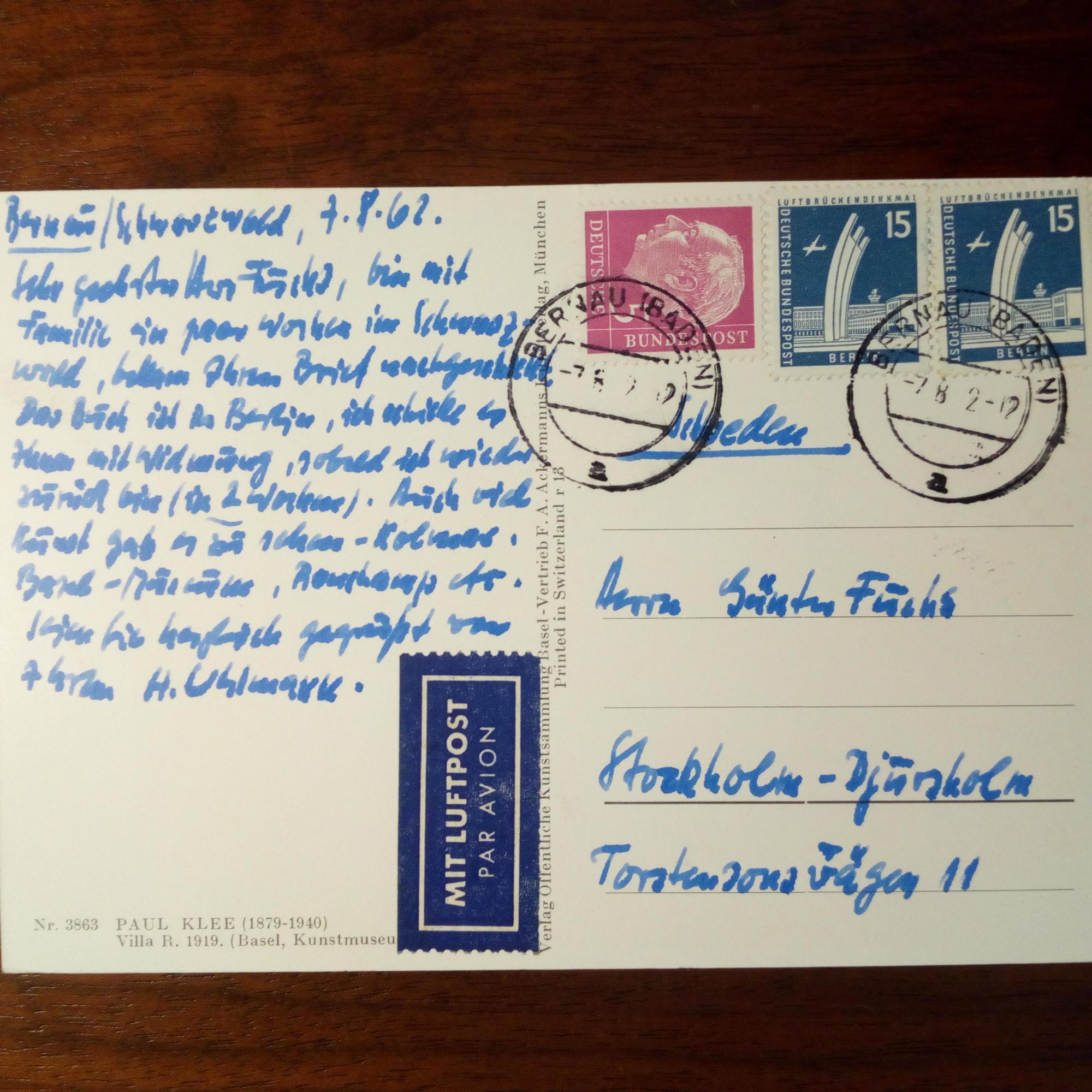 1900-75, Bildhauer - E. postal. Kunst-Ansichtskarte mit U., Bernau 7.8.1962. An den Antiquar Günter Fuchs in Stockholm betr. Terminen: ...bin mit meiner Familie ein paar Wochen im Schwarzwald...