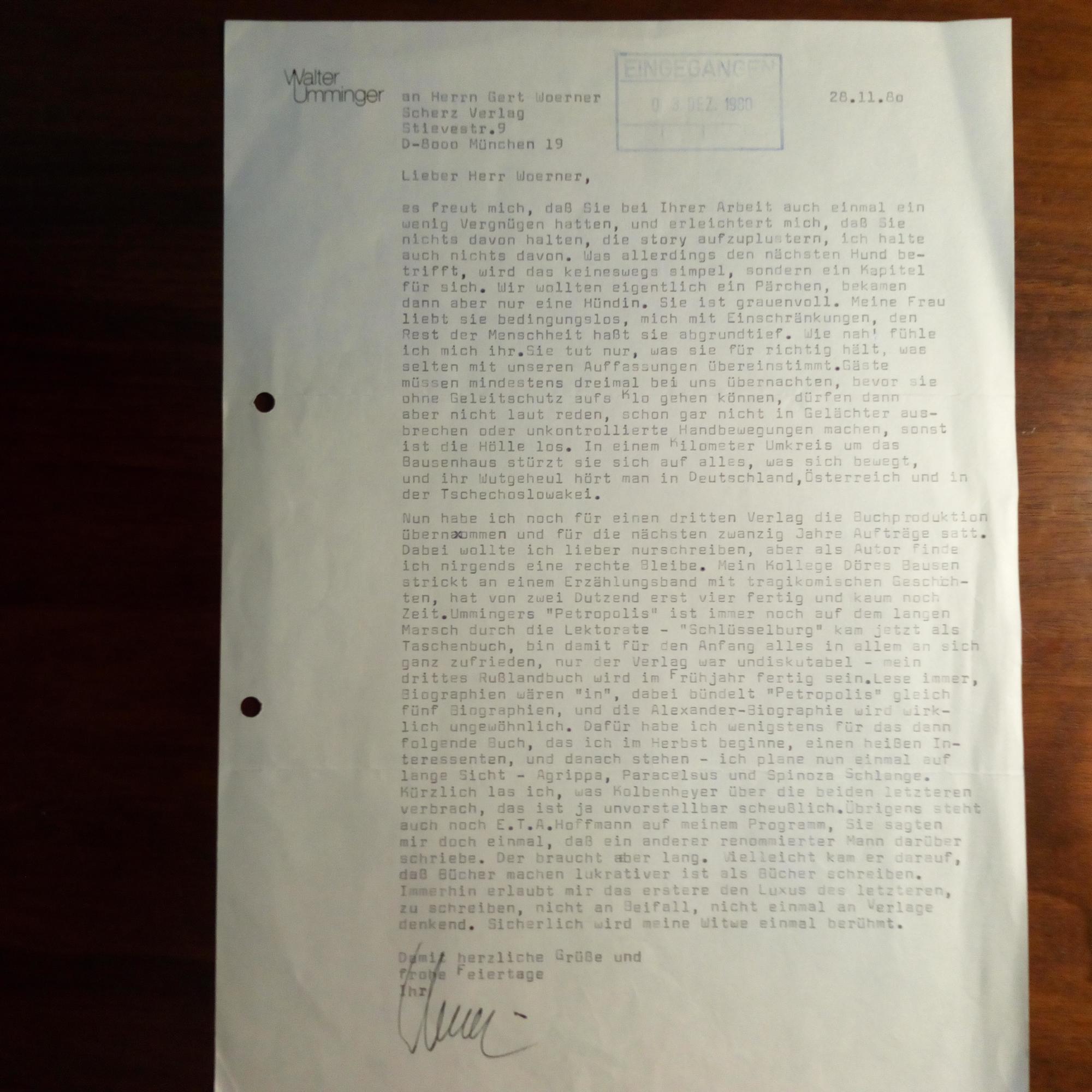 1922-95, Schauspieler, Sport-journalist und Schriftsteller - Brief mit U., 28.11.1980, 1 S. 4°, dicht geschr., Eing.stempel, gel. An den Lektor im Münchner Scherz-Verlag Gert Woerner: Humorvoll über seinen Hund und seine Arbeiten.
