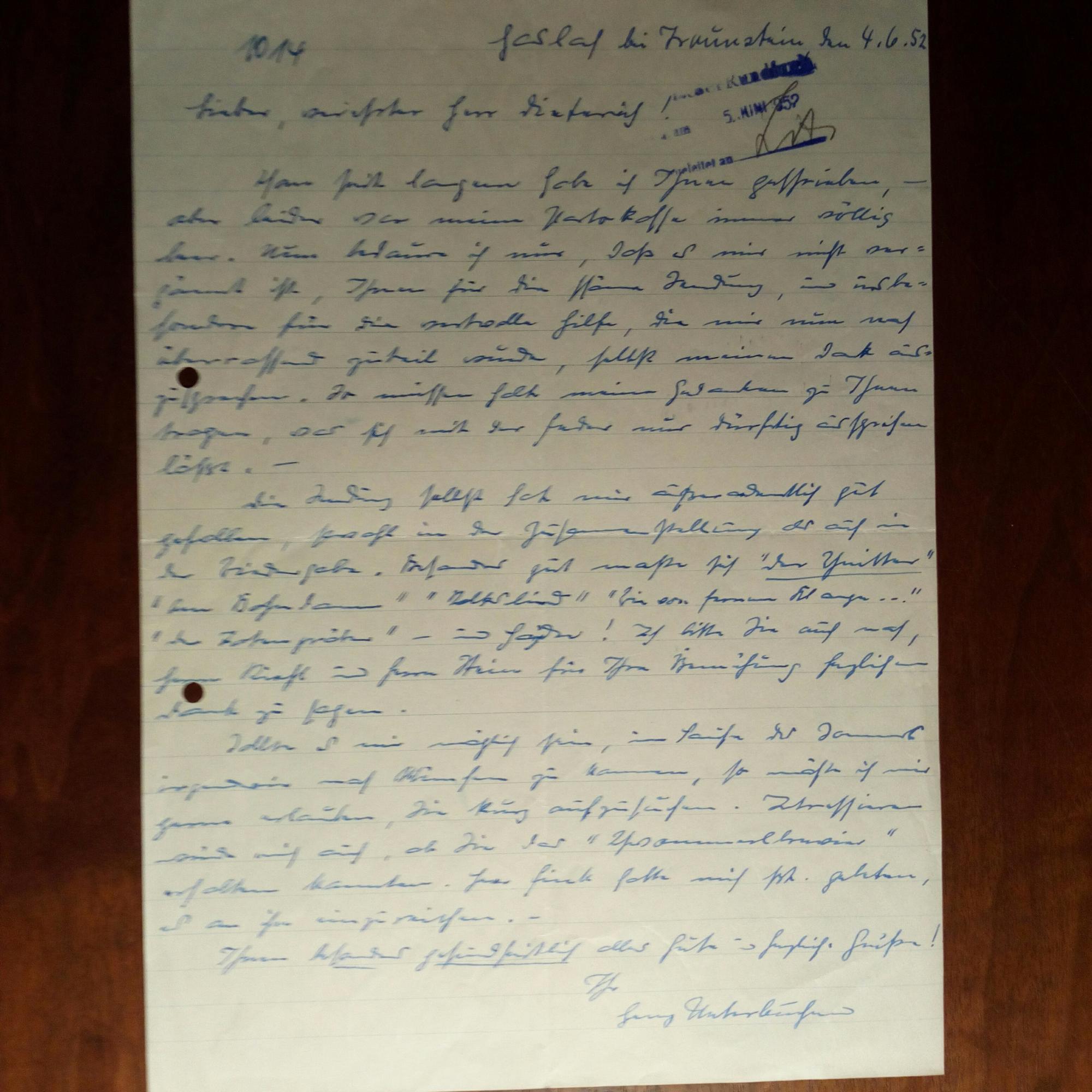 1908-78, Poet des Chiemgaus - 3 e. Briefe mit U., Haslach (Traunstein) 1952-58, 1 S. 4° und 2 S. 8°, Eingangsstempel des Bayer. Rundfunks, kl. Wasserfleck, gel. Betr. seiner Arbeiten.