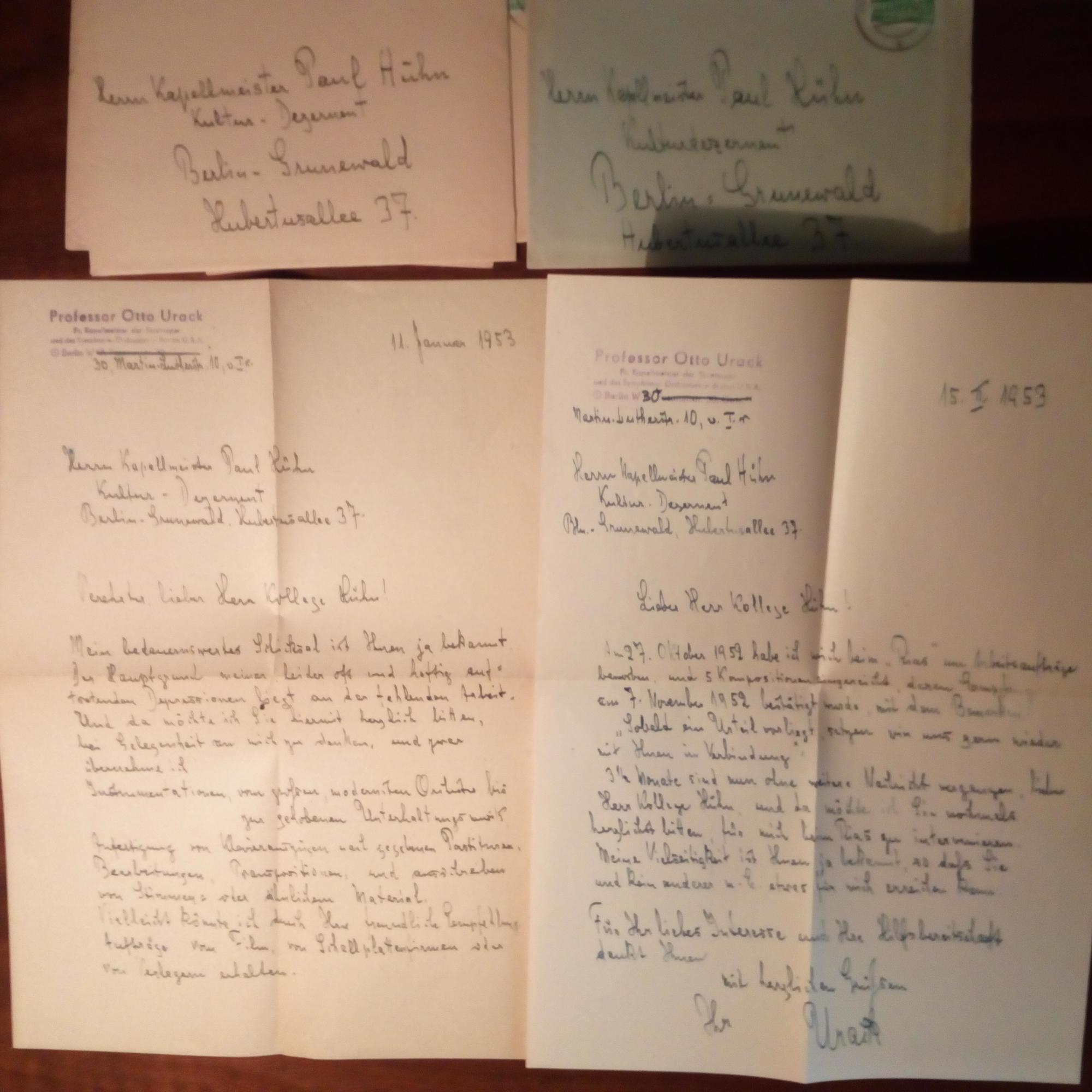 1884-1963, Komponist - 4 e. Briefe mit U., Berlin Jan.-März 1953, zus. 6 ½ S. 4°, sowie e. Abschrift eines anderen Briefes, alle mit e. postal. Umschlag. Adressat wie vor. Will seine Kompositionen vom "Rias-Sender" aufführen lassen. ...möchte...den Versuch machen, mein Gehör durch Schock-Therapie zum Leben zu erwecken, dazu brauche ich aber Geld...vor allem zur Behebung meiner seelischen Depressionen brauche ich Arbeitsaufträge...