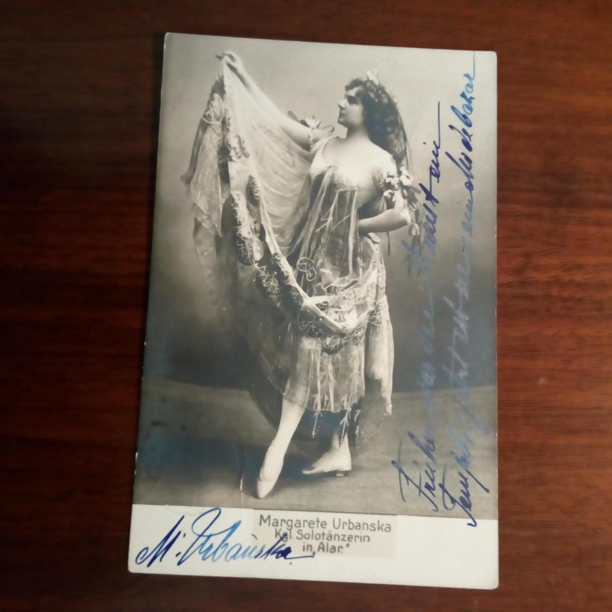 1865-1928, Tänzerin - Foto (als "Königliche Solotänzerin in 'Alar'") mit e. Zitat und U., als e. postal. Ansichtskarte (21.11.1903, Marke abgelöst). "Früher war die Kunst ein Tempel...".