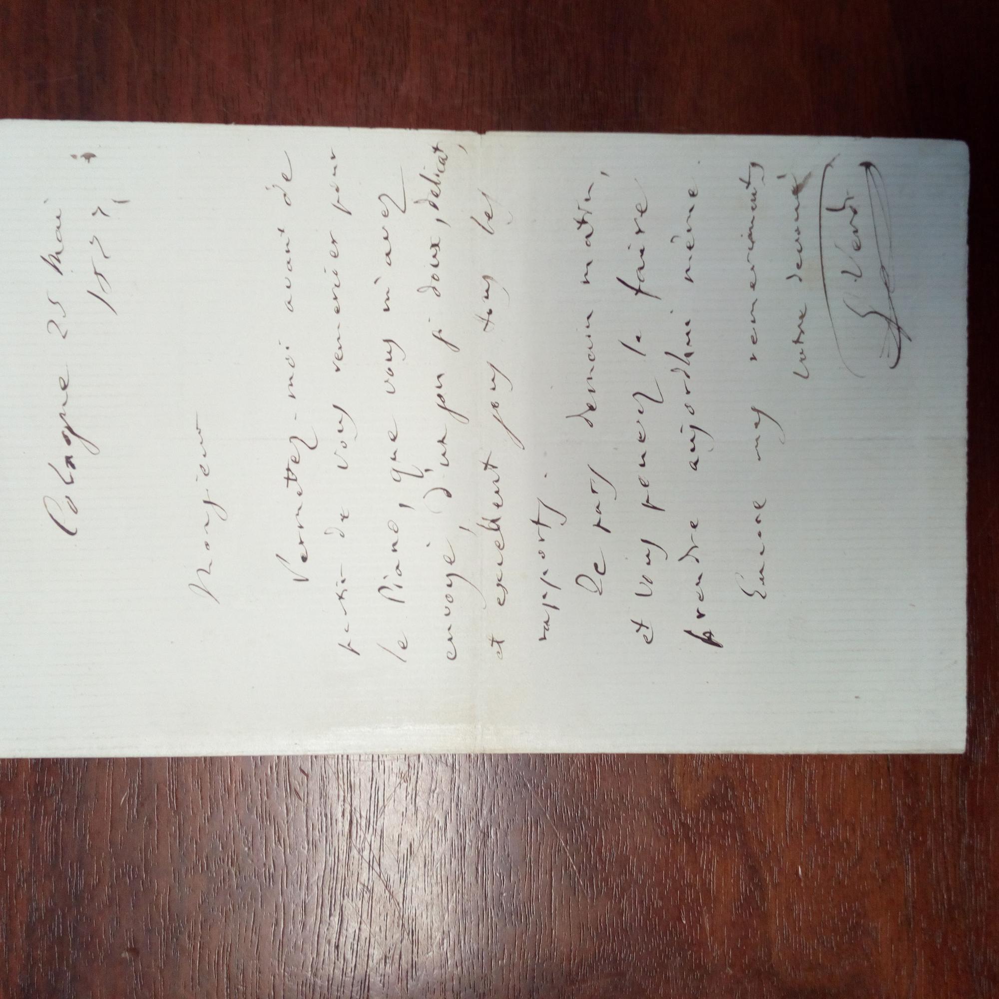 1813-1901, italien. Opern-Komponist - E. Brief mit U., Köln 25.5.1877, 1 S. 8°, minimale Altersspuren. ...Permettez-moi avant de partir de vous remercier pour le Piano, que vous m'avez envoyé, d'un son si doux, delicat, et excellent sous tous les rapports...