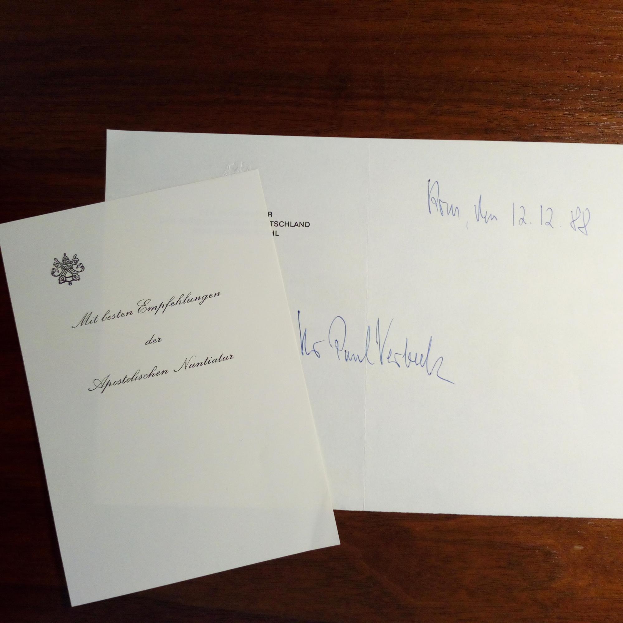 1925-2019, Diplomat - 8°quer-Blatt mit U., Rom 12.12.1988, Br.kopf als dt. Botschafter beim Vatikan. Dazu Ded.blatt.