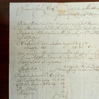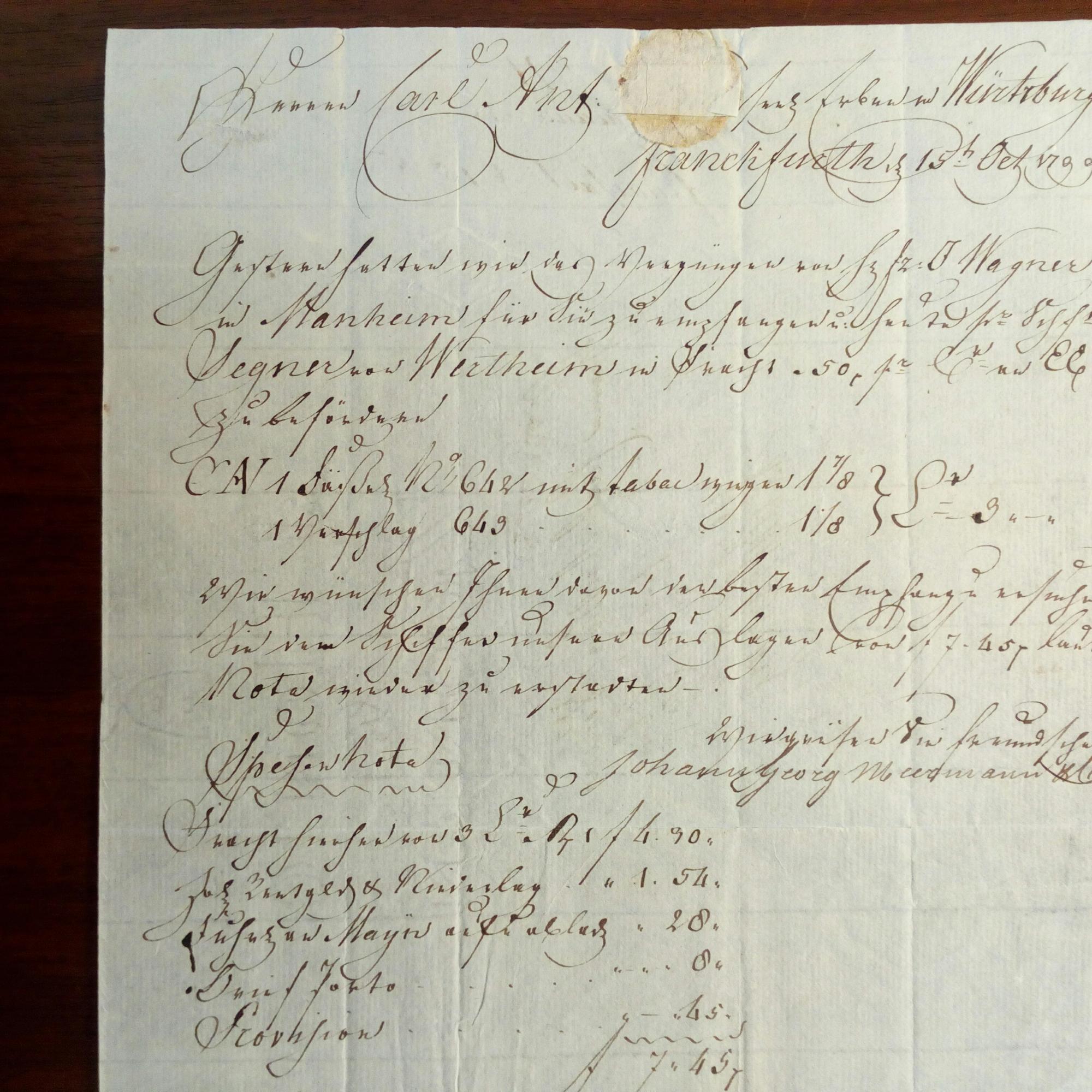 1663-1763, Gewürzhändler und Kommunal-politiker in Würzburg, erster Zeuge 1749 im Hexenprozeß gegen Maria Renata Singer von Mossau - 3 Rechnungen an die Fa. Venino & Erben in Würzburg: 4.1.1790, Fa. Augstell & Schefer Frankfurt, 27.10.1797, Kaufmann Peter Matheo in Mainz, und 15.10.1799 Fa. Meermann in Frankfurt. Je 1 S. kl.4°, e. Adresse, Siegelrest, Stempel.