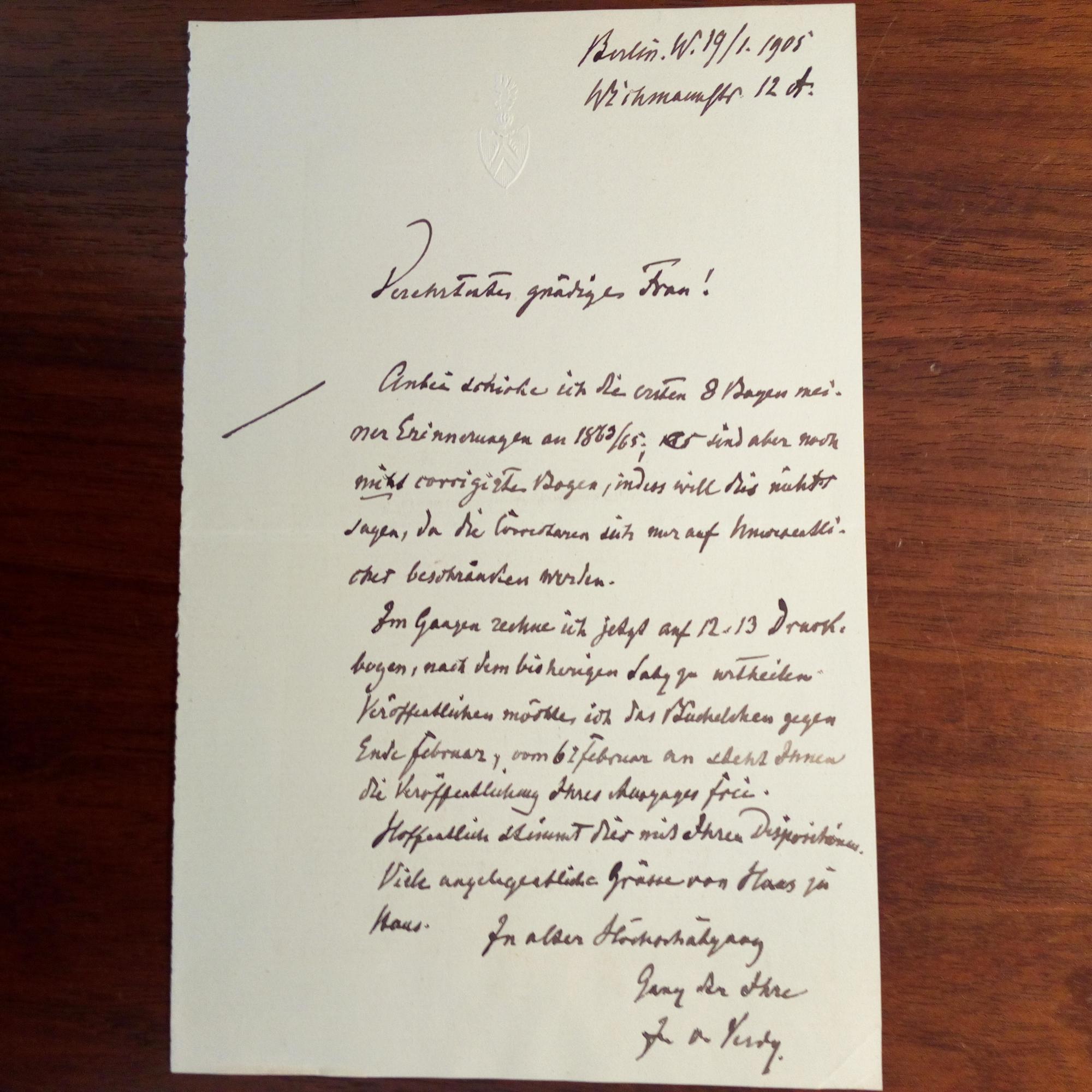 1832-1910, preuß. General, Kriegsminister und Militär-Schriftsteller - E. Brief mit U., Alt-Aussee 13.8.1890, 4 S. 8°, gedr. Emblem am Kopf. Dankt einer Dame herzlich für die Betreuung seines Sohnes Louis während eines Aufenthaltes in Wien und über weitere Reisepläne mit seiner Familie in Österreich. Beiliegen 4 e. Briefe mit U., Berlin 1899-1905, zus. 10 S. 8°, gepr. Wappen am Kopf, einer mit e. Zusatz mit U., seiner Gattin Luise Karoline Natalie (1837-1909). Betr. versch. Publikationen von sich und der Adressatin: Lehnt Veröffentlichung eines Details aus Diskretionsgründen ab, u.a. Dazu Faksimile-Brief (Dank für Grüße zur Gold. Hochzeit 1905). Alles mit kl. Gebr.spuren.