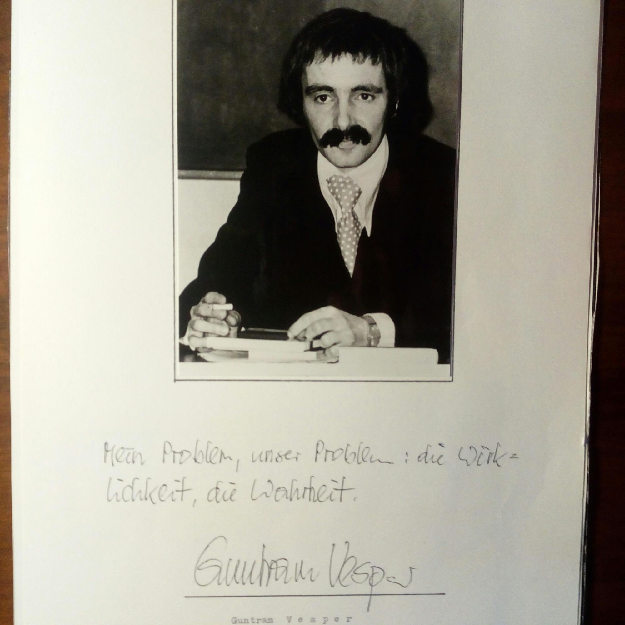 1941-2020, Schriftsteller - 1. Kurzbrief mit U., Göttingen 3.8.1967, 1 S. 8° quer, Bearb.vermerke, mit postal. Umschlag. An den Direktor des Scherz-Verl. in München, Kurt Desch: ...Wie ich höre, wollen Sie "Die Weltbühne" neugebären; darf ich fragen, ob Sie progressiven literarischen Beiträgen Raum geben wollen?... 2. Brief mit U., 9.8.1970, Abs.stempel, 1 S. 4°. An Antiquar Stüve in Osnabrück: Bestellt versch. Bücher (meist zu Kriminal-Fällen im 19. Jh.). 3. E. Zitat "Mein Problem, unser Problem: die Wirklichkeit, die Wahrheit." und U. unter auf 4° mont. professionellem Hochgl.-Pfo. (70er Jahre). 4. 4°-Blatt mit e. Gedicht "Ganz, ganz unten" (33 kurze Z.), mit e. Monogramm. 5. Karte mit sehr schönen e. Dankeszeilen, U. und D. 21.1.1991 (Rücks. Druck eines Gedichtes). Dazu Einladung zu den Gießener Literaturtagen 1990, e. Anschreiben mit U. von-, und postal. Umschlag an E. Zieschank in Bad Nauheim. Beiliegt Vorzugsausgabe s. Ged.bandes "Die Inseln im Landmeer", Verl. "Pfaffenweiler Presse" 1982.