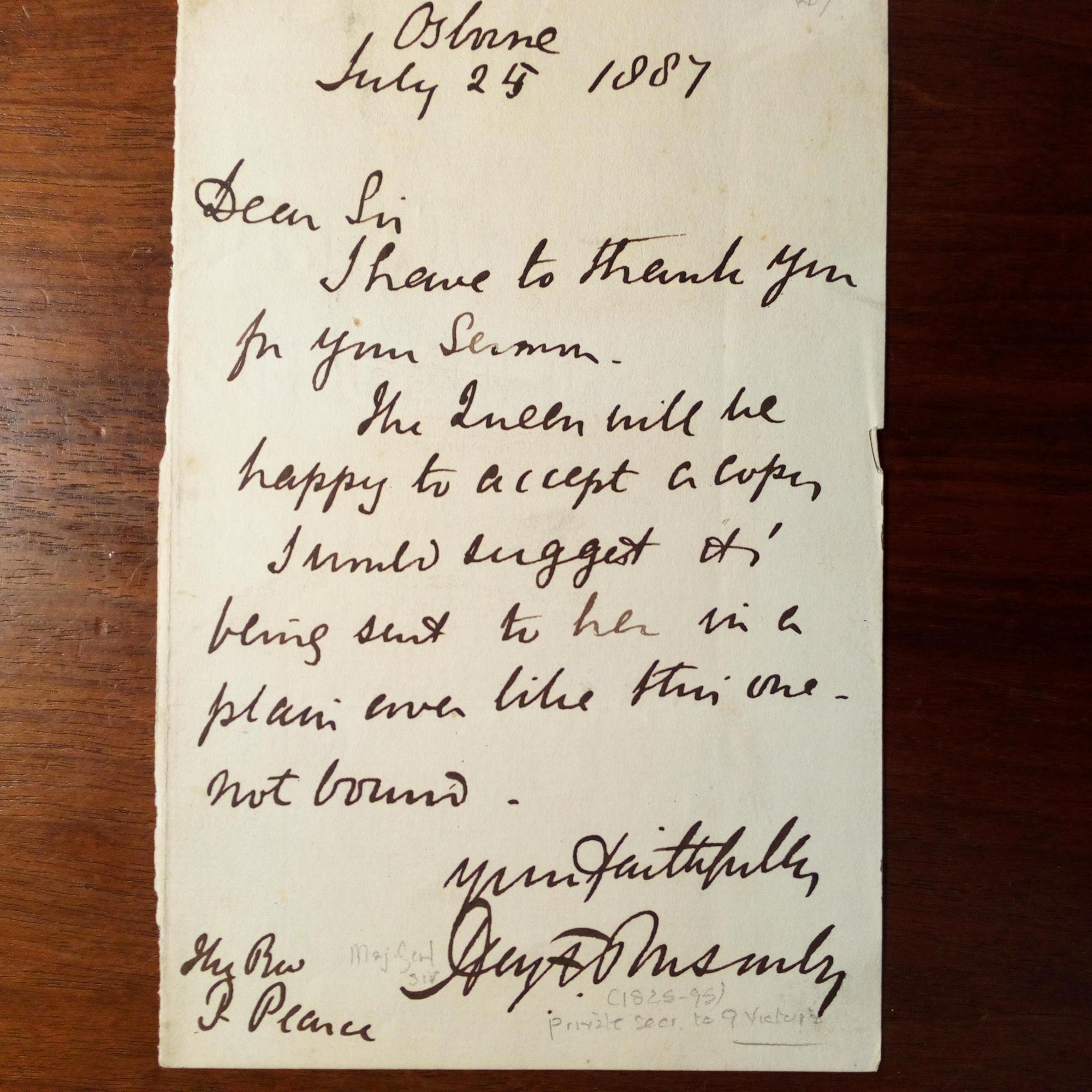 1819-1901, Königin - PONSONBY Henry, 1825-95, brit. Major, ihr Privatsekretär - E. Brief mit U., Osborne House (ihr Landsitz in Wales) 25.7.1887, 1 S. 8°, kl. Altersspuren. Dankt für einen Predigttext: ...The Queen will be happy to accept a copy...