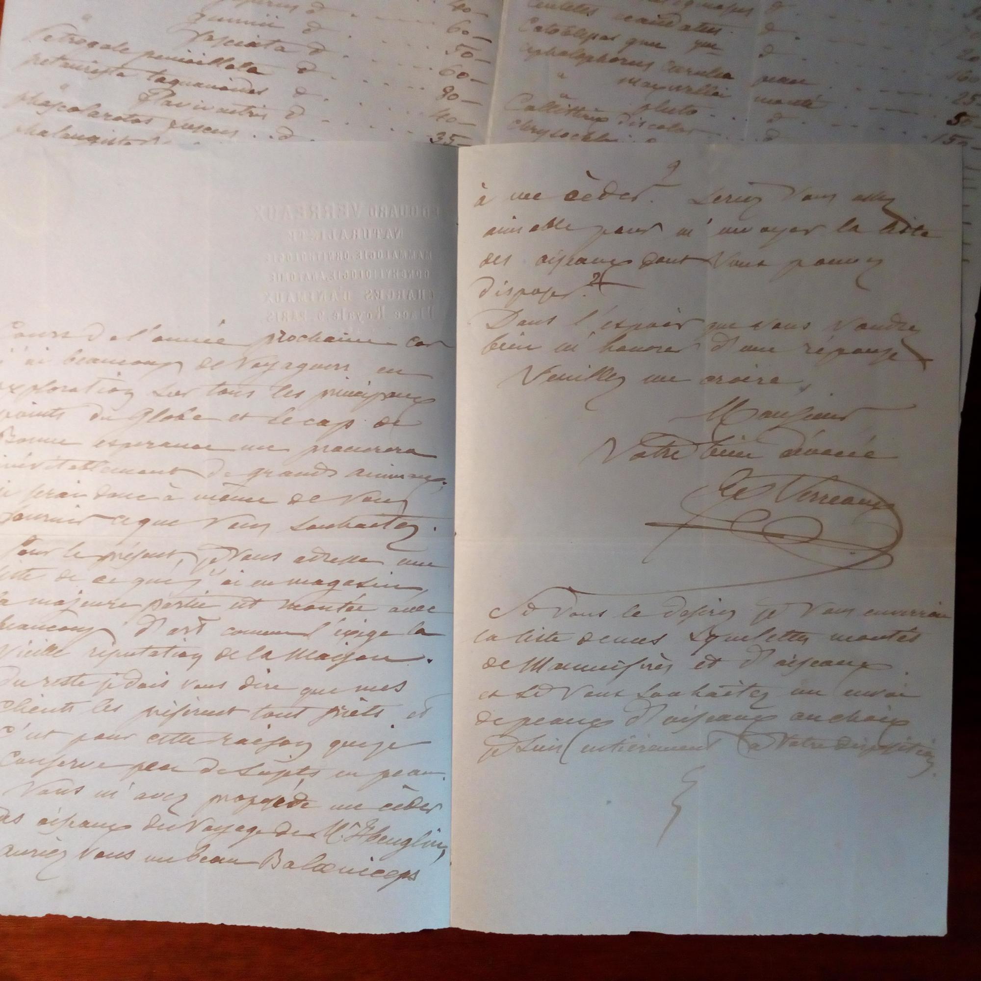 1873-78, frz. Botaniker, Zoologe und Forschungsreisender - E. Brief mit U., Paris 8.10.1864, 3 S. 8°, dicht geschr., gepr. Br.kopf mit kl. Pfo. Ausführl. zu seinen Gesundh.problemen. Dazu e. lange Liste von Pflanzen, die er übersendet (4 ¾ S., kl. Schrift). Kl. Beilage.
