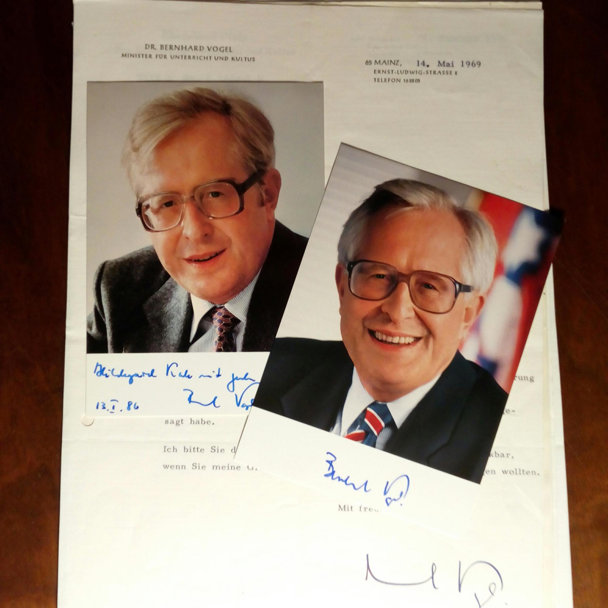 1932-2025, Politiker (CDU), Ministerpräsident von Sachsen, später Thüringen- 2 Farb-Pfo. mit U. Beiliegen 11 Briefe mit U.: Dank für Glückwünsche, Termine, Beteiligung an einer Künstler-Kolonie u.a., 1969-94, 2 mit postal. Umschlag u.a. kl. Beilagen.