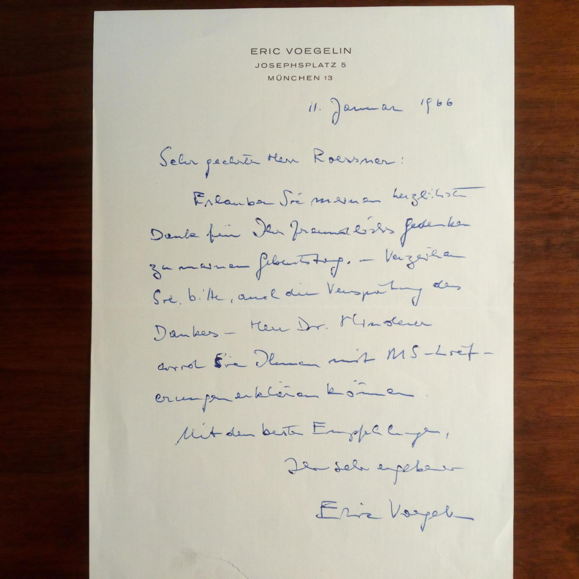 1901-85, Politologe und Geschichtsphilosoph - E. Br. m. U., (München) 11.1.1966, 1 S. 8°, Br.kopf, kl. Riss. Bedankt sich beim Lektor des Piper-Verl. Hans Roessner (1910-97) für Geb.wünsche.