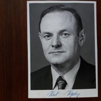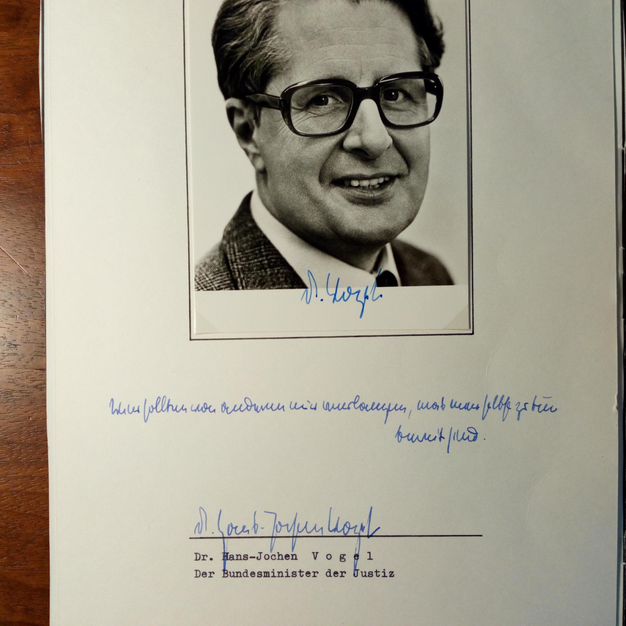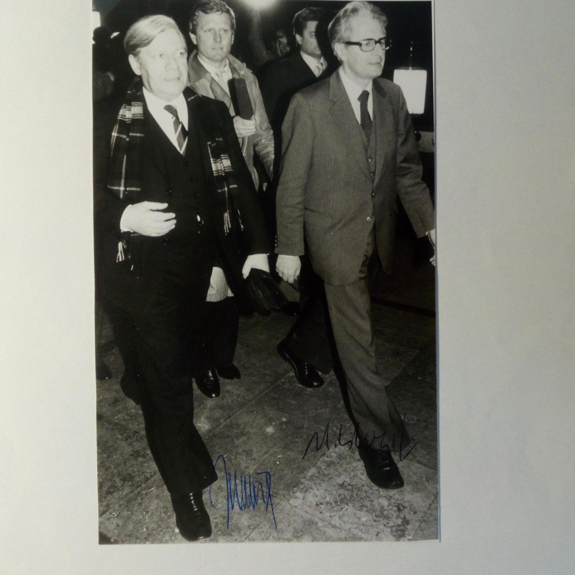 1926-2020, Politiker - 7 Autographen: Kl. Broschüre "Deshalb bin ich Sozialdemokrat" mit U. und D. 10.4.1973, zeitgen. Pfo. mit U., Foto (zus. mit Bundeskanzler Helmut Schmidt), mit beiden U., FDC mit U. (25 Jahre BVG, 17.2.1976, weitere U. von Ernst Benda) , persönl. Weihnachtskarte mit e. Zeilen und U. (1978), Foto (zus. mit Schmidt und Bundespräsident Karl Carstens, mit allen 3 U.) Karte mit e. latein. Zitat, U. und D. 1988, Brief mit Dank für Wünsche zum 70. Geb. (München 2005) mit E. und U., priv. Briefkopf. Beiliegt Ded.karte.