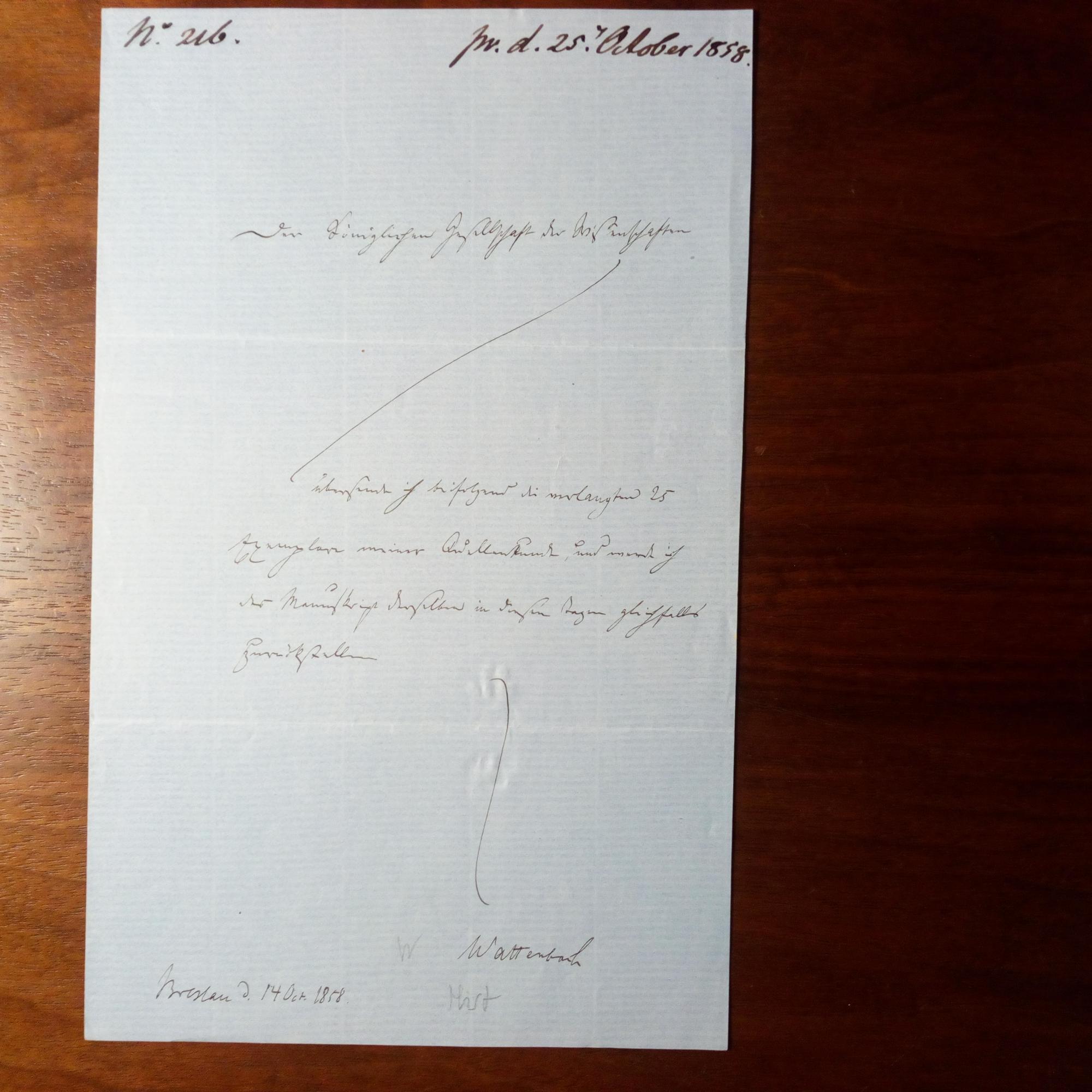 1819-97, Mediävist und Paläograph - E. Br. m. U., Breslau 14.10.1858, 1 S. 8°, Aktenvermerk. Sendet der "Königlichen Gesellschaft der Wissenschaften" 25 Exemplare seiner "Quellenkunde".