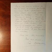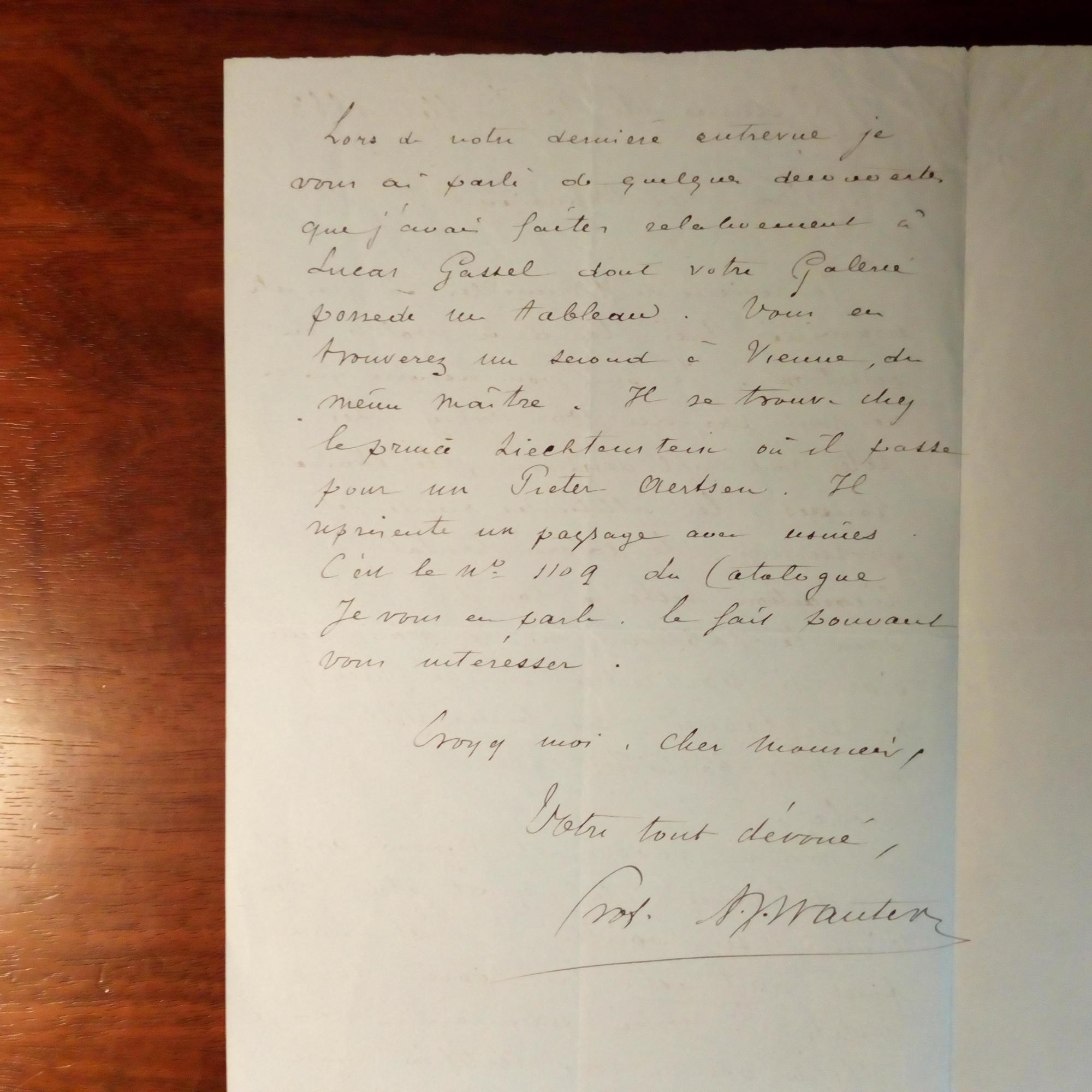 1846-1933, belg. Maler - E. Brief mit U., Ostende 12.7.1883, 1 ¾ S. 8°, kl. Schrift. Berichtet von einer Ausstellung in Brüssel: ...Je peux vous assurer que ce sont pas des Van Orley..., betr. eines Landschafts-Gemäldes von Lucas Gassel: ...Il se trouve chez le prince Liechtenstein (der spätere Johann II.) ou il passe pour un Piter Aertsen... u.a.