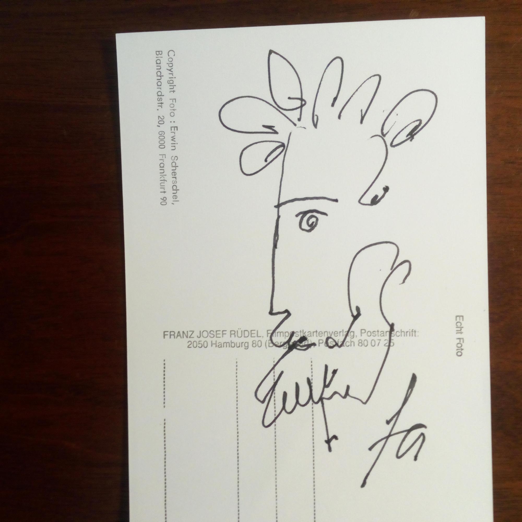 1924-2018, Maler und Autor - Pfo. mit U. und D. 4.10.2003. Auf Rückseite kl. e. Zeichnung und Paraphe. Mit e. postal. Umschlag. Beiliegt Presse-Artikel.