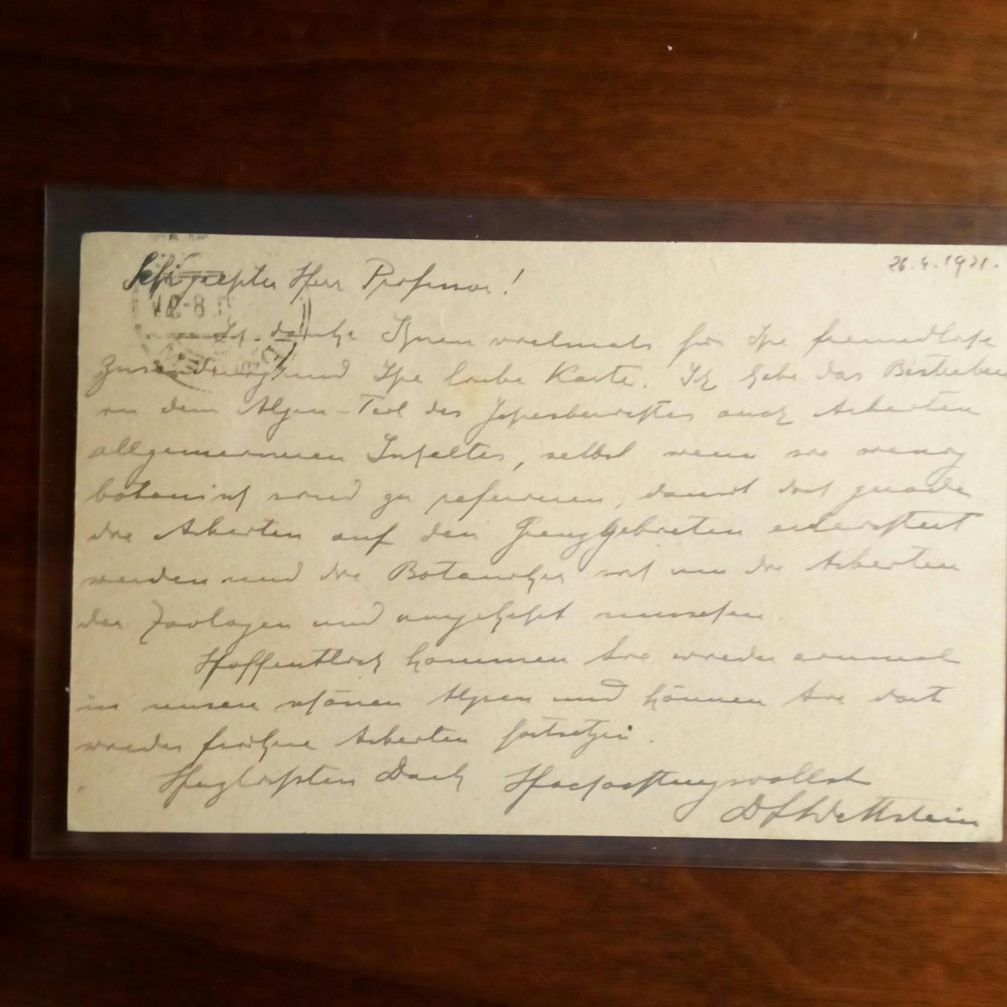 Ritter von Westersheim, 1895-1945, Botaniker - E. postal. Postkarte m. U., (Berlin) 26.4.1921. An den Zoologen Vincenz Brehm (siehe Nr. 41) in Eger: Über seine Pläne, beim "Jahrestreffen" auch auf Fragen "allgemeinen Inhalts" und "Grenzgebiete" einzugehen.