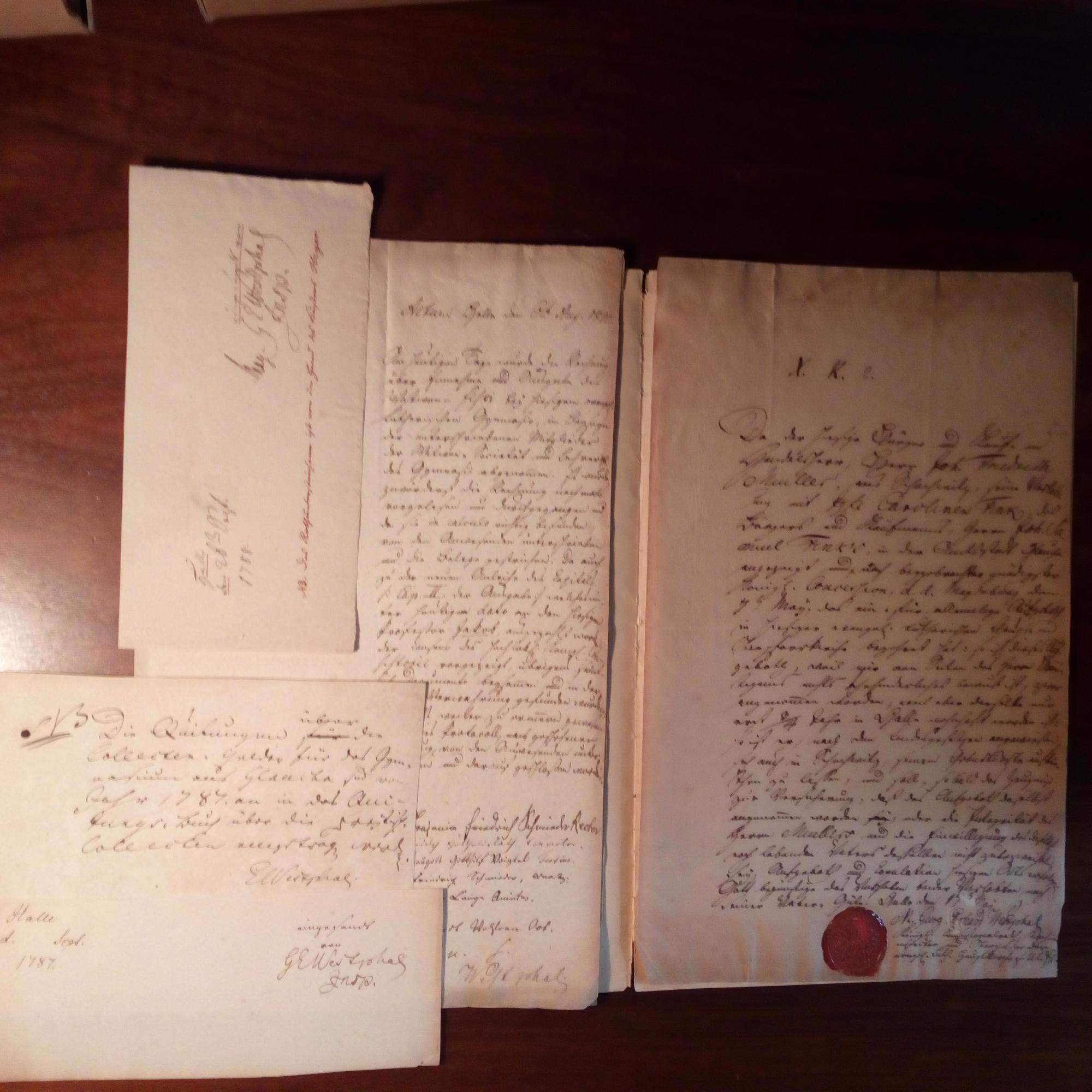 1752-1808, Evang. Theologe, Professor u. Konsistorialrat in Halle - Amtl. Schreiben mit seiner und 6 weiteren U., Halle 4.8.1800, 1 S. folio, halbseitig klein beschrieben. Beglaubigung des Abschluss-Protokolls der Rechnungsprüfung "bey hiesigem evangel-lutherischen Gymnasio". Beiliegen: e. Quittung "über die Collecten-Gelder für das Gymnasium aus Glaucha 1787" und Fragment eines Schreibens m. U. (Halle 1787).