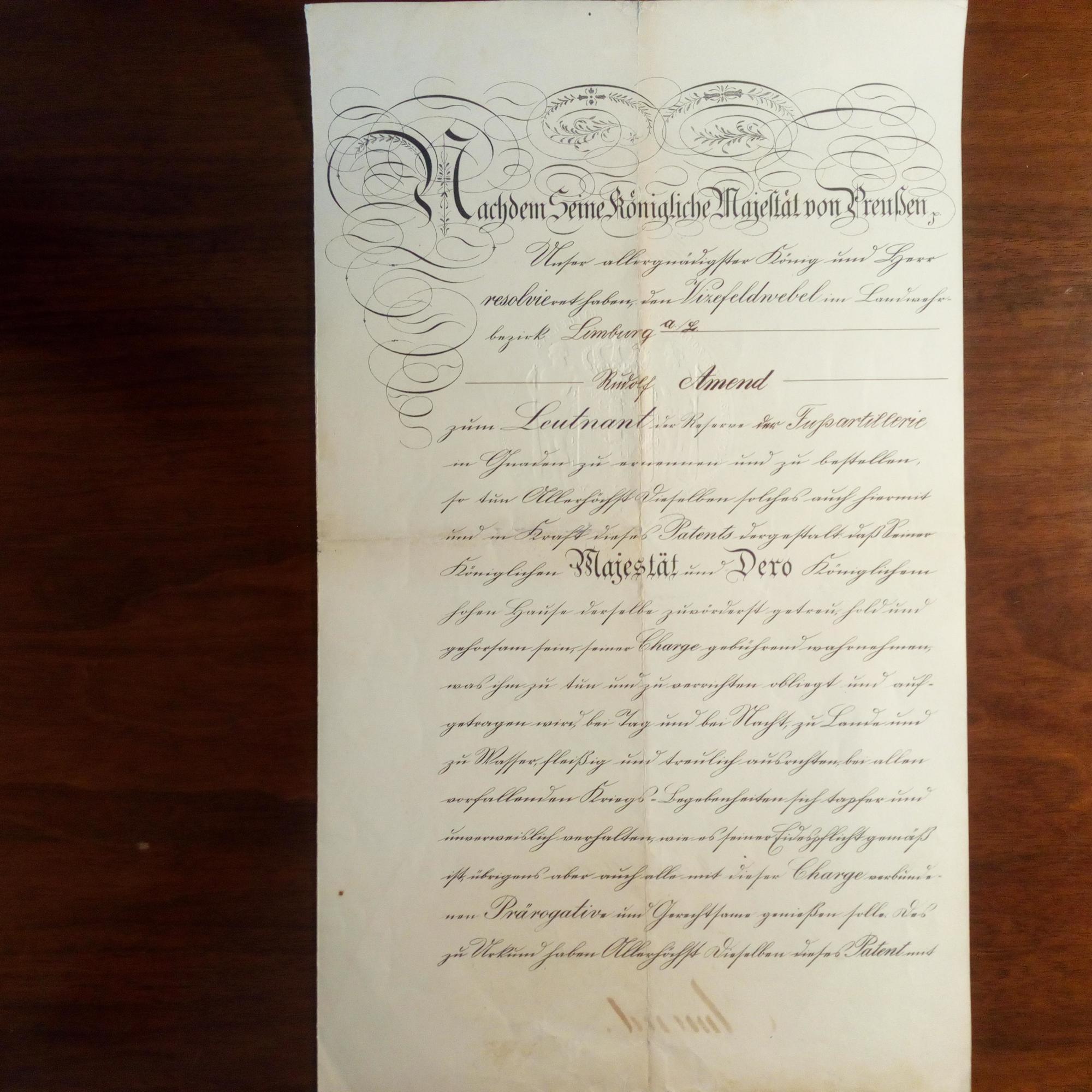 1859-1941, König von Preußen und dt. Kaiser - Urkunde ohne U., "Großes Hauptquartier" 5.1.1917, 2 S. folio, Adresse. Vizefeldwebel Amend wird zum "Leutnant der Reserve der Fußartillerie" ernannt. M. großem, handgeprägtem Siegel des Königs. ...des zu Urkund haben Allerhöchst dieselben dieses Patent Dero Insiegel bedrucken und autorisieren lassen...