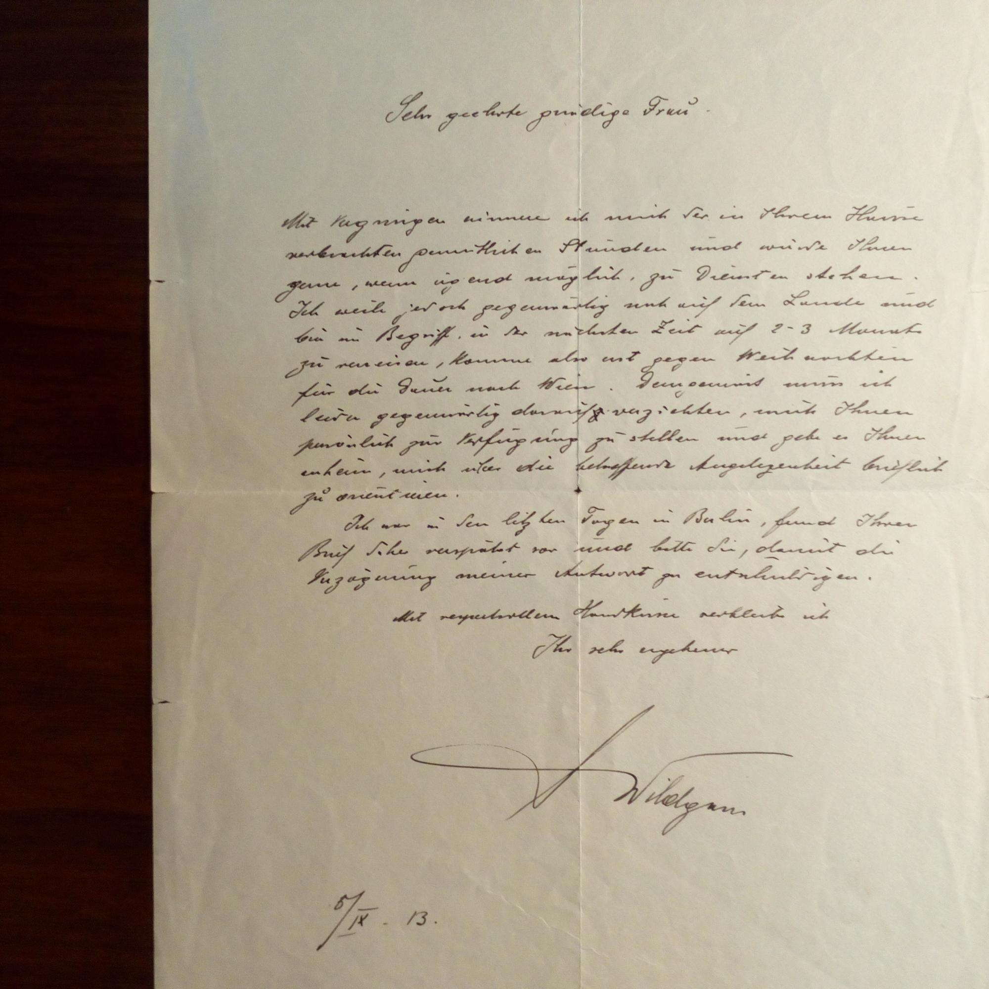 1881-1932, österr. Schriftsteller - Schöner e. Brief mit U., 5.10.1913. An eine Dame: Er müsse verreisen und könne ihr erst ab Weihnachten "zur Verfügung stehen". Beiliegen: Brief mit U., Wien 1930, 1 S. 4°. Muss dem Maler Willi Stieborsky Bühnenbilder leider wieder zurückschicken. 3 Blätter mit großer U. und D. 1915 (alte U.-Form), 1929 und 1930, schönes Pfo. mit U. und D. 1931. 2 e. Briefe und e. postal. Ansichtskarte mit U. seiner Gattin, der Schriftstellerin Lilly Würzl-Wildgans (1886-1968), und e. Billett mit Monogramm von dem Komponisten Friedrich Wildgans (1913-65), Fotos, Traueranzeige u.a.
