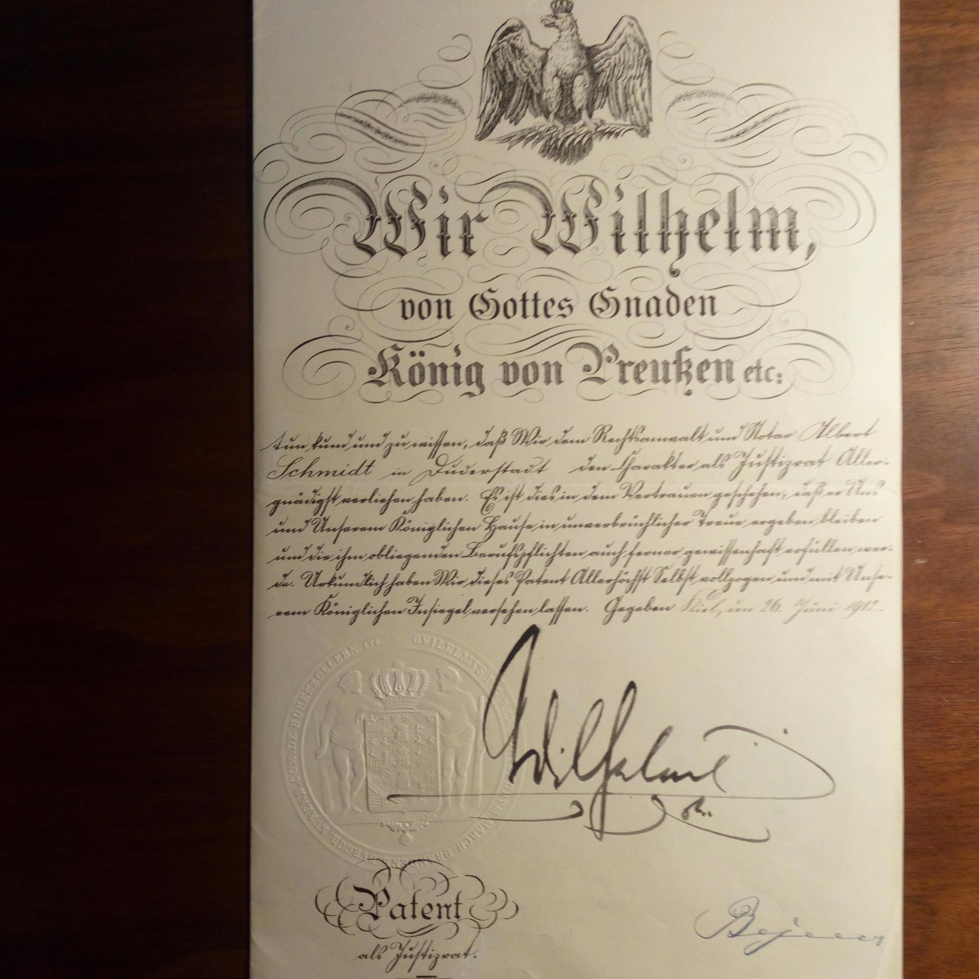 1859-1941, Kaiser - Urkunde mit U., Kiel 26.6.1912. gegenzeichn. von Justizminister Max von Beseler (1841-1921), 1 S. folio, gepr. Siegel. Ernennung von Albert Schmidt in Duderstadt zum Justizrat. Mit Begleitschreiben mit U. des Sekretariats, mit postal. Umschlag.