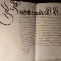 1548-1626, Herzog - Urkunde mit U., München 29.6.1593, 1 S. folio quer, Pergament, Siegel fehlt, sehr guter Zustand. Lehensbrief für den Pfleger von Mainburg und Präs des bayer. Hofrats Adam Vetter von der Gilgen (gest. 1596) mit Gütern im "Gericht Kirchperg" (Bayer. Wald) mit allen Rechten ("Niedergerichtbarkeit, kirchenrechnungen, Todtfahl, und Scharwerch, auch Fuetersamblung, und Holzferth...").