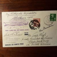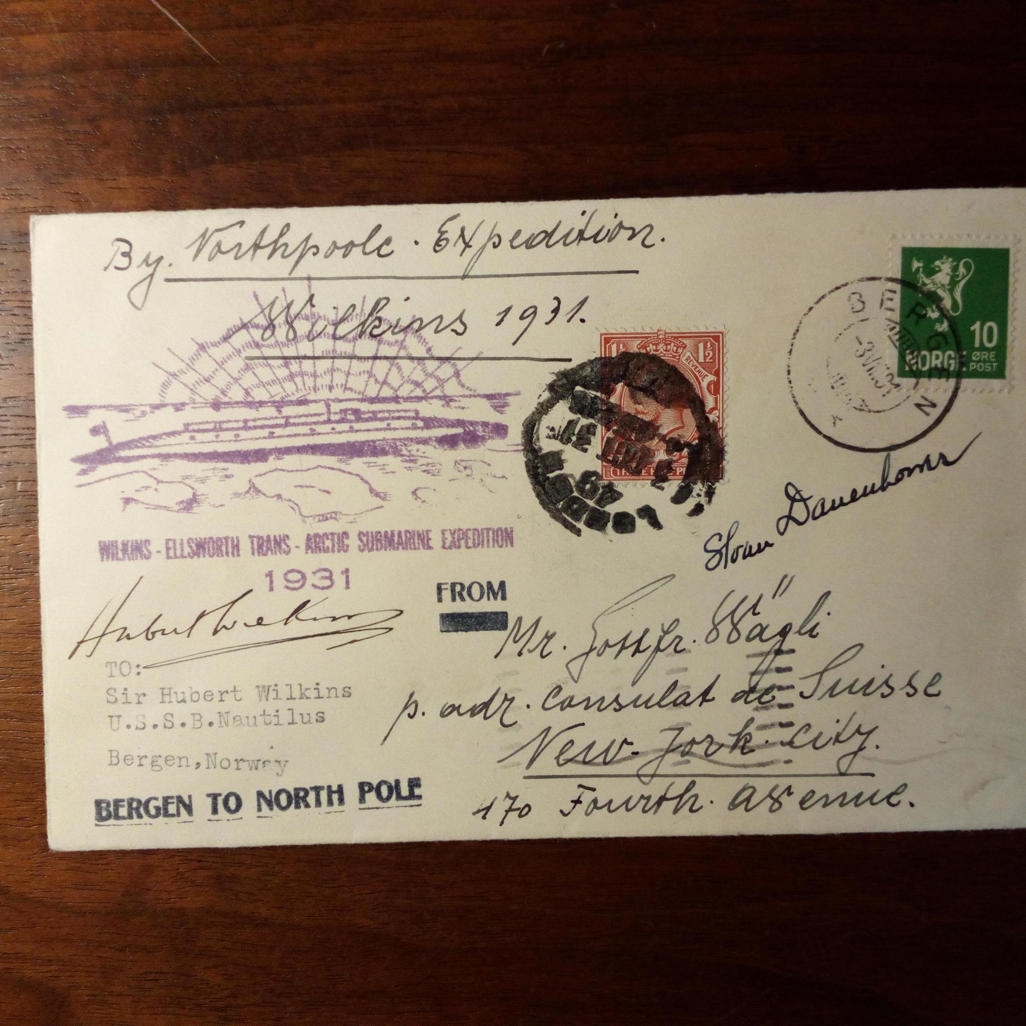 1888-1958, austral. Flieger, Reporter und Polarforscher - Postal. Umschlag "W.-Ellsworth Trans-Arctic-Submarine-Expedition" (Bergen 3.7.1931) mit Sonderstempeln, Beschriftungen und 2 U., dabei seine. Beiliegt das Heft "The W.-Hearst Antarctic Expedition 1928-1929" (viele Fotos) mit Widm. mit U. für den urugay. Feldvermesser und Geologen Hamlet Bazzano (1876-1939) auf der Vorderseite.