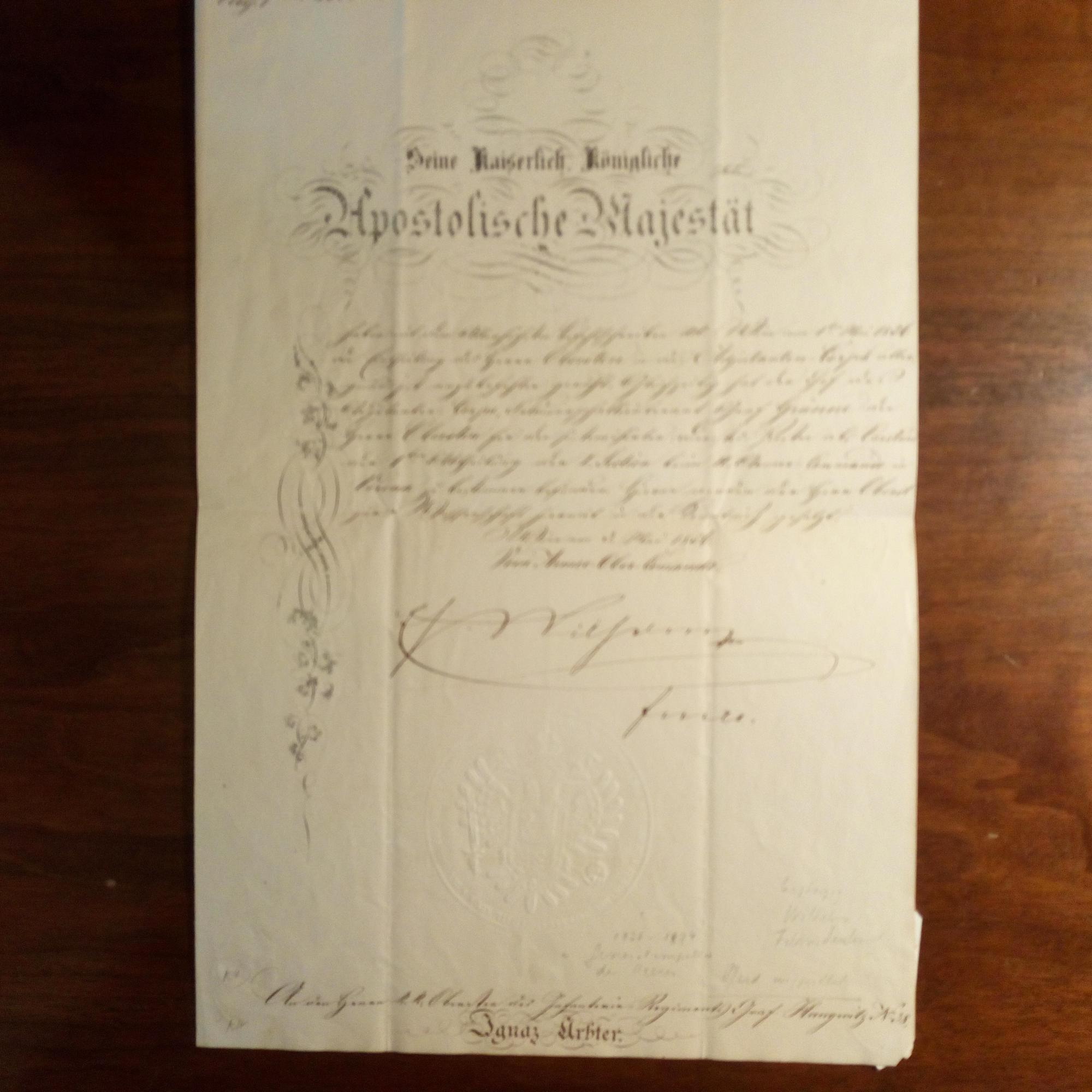 1827-94, Erzherzog, General - Urkunde m. U., Wien 3.5.1856, 1 S. gr. folio, Adr., papierged. Lack- und gepr. Siegel, Stich-Verzierung. Oberst Ignaz Arbter wurde auf Grund des Betreibens von Graf Grünne in den "Adjudanten-Corps" in Verona versetzt.