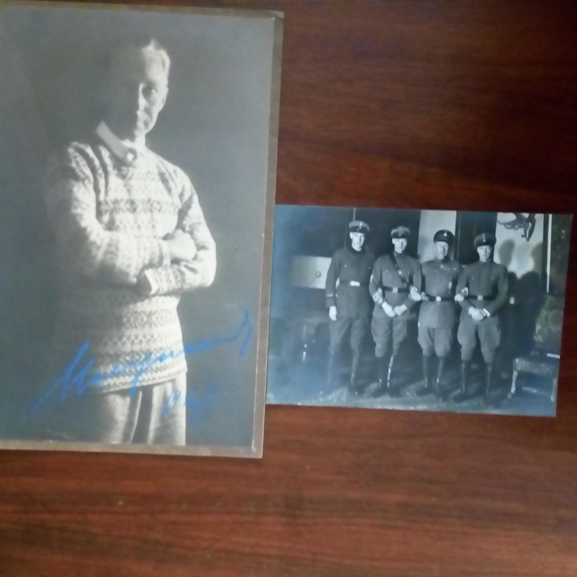 1882-1951, Prinz (Sohn von Kaiser Wilhelm II.) - Groß-Pfo. (ca. kl. 4°, in Zivil) mit U. und Jahr 1929, blauer Farbstift, mont. Beiliegt Foto (zus. mit 3 Offizieren) mit U. und D. Mai 1931 (Tintenstift) auf Rückseite. Beiliegt Telegramm mit Faksimile-U. des Kaisers.