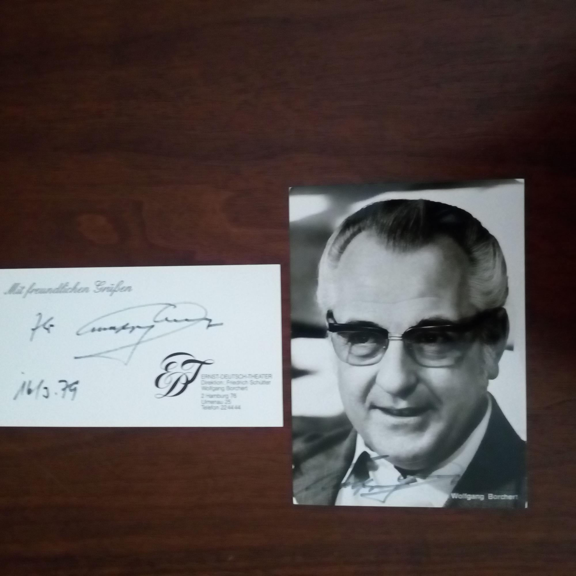1922-2007, Schauspieler und Theaterleiter - Hochglanz-Pfo. mit U., Ecken minimal bestoßen. Auf Rückseite Widm. und U., 16.3.1979. Dazu Ded.karte als Direktor des von ihm gegr. Ernst-Deutsch-Theaters in Hamburg mit schöner E., U. und gleichem D.