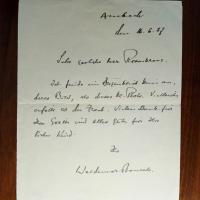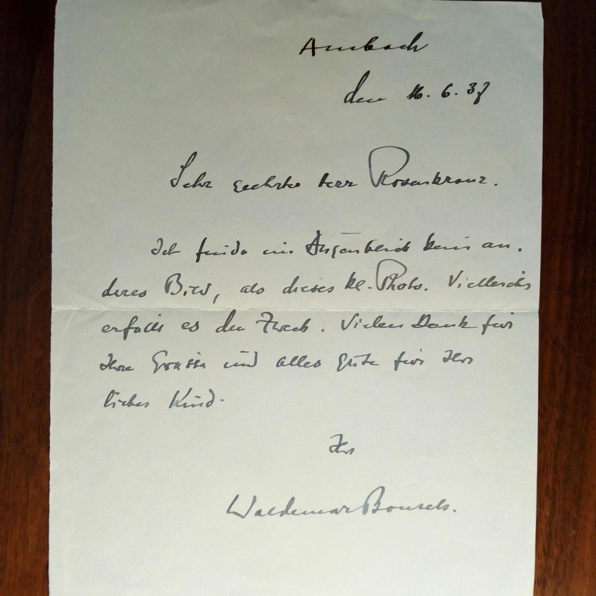 1880-1952, Verleger und Schriftsteller ("Biene Maja") - E. Brief mit U., Ambach (am Starnberger See) 16.6.1937, 1 S. kl. 4°, mit e. postal. Umschlag. An Wilhelm Rosenkranz in Darmstadt: Schickt ihm "dieses kl. Photo. Vielleicht erfüllt es den Zweck..." (liegt nicht mehr bei). Beiliegt Kärtchen mit U. (Bleistift).