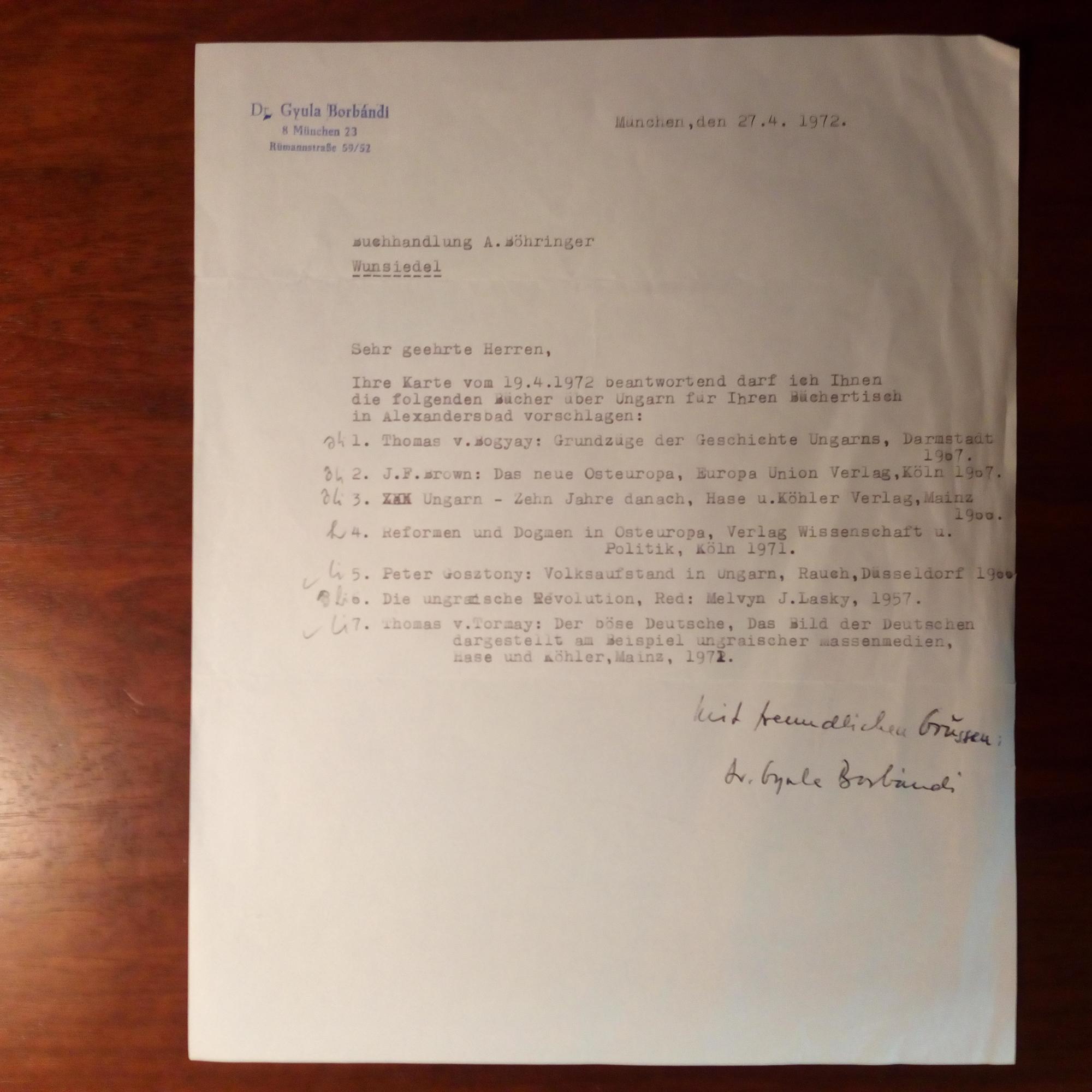 1919-2014, ungar. Historiker - Brief mit e. Grüßen und U., München 27.4.1972, ¾ S. 4°. An die Buchhandlung Böhringer in Wunsiedel: ...darf ich Ihnen die folgenden Bücher über Ungarn für Ihren Büchertisch in Alexandersbad vorstellen... Nennt 7 Titel.