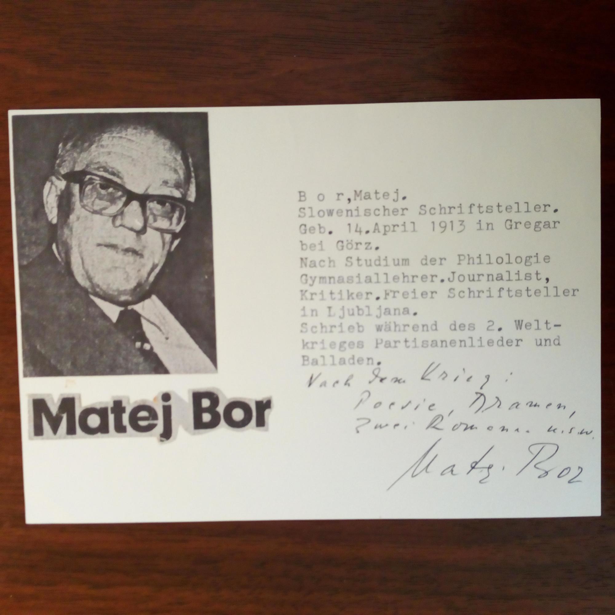 1913-93, slowen.-jugoslaw. Partisan, Journalist und Dichter - handgemachte Biographie-Karte (mit Pfo.) mit e. Zusatz und U. Mit postal. Umschlag (Radovljica 24.4.1960).